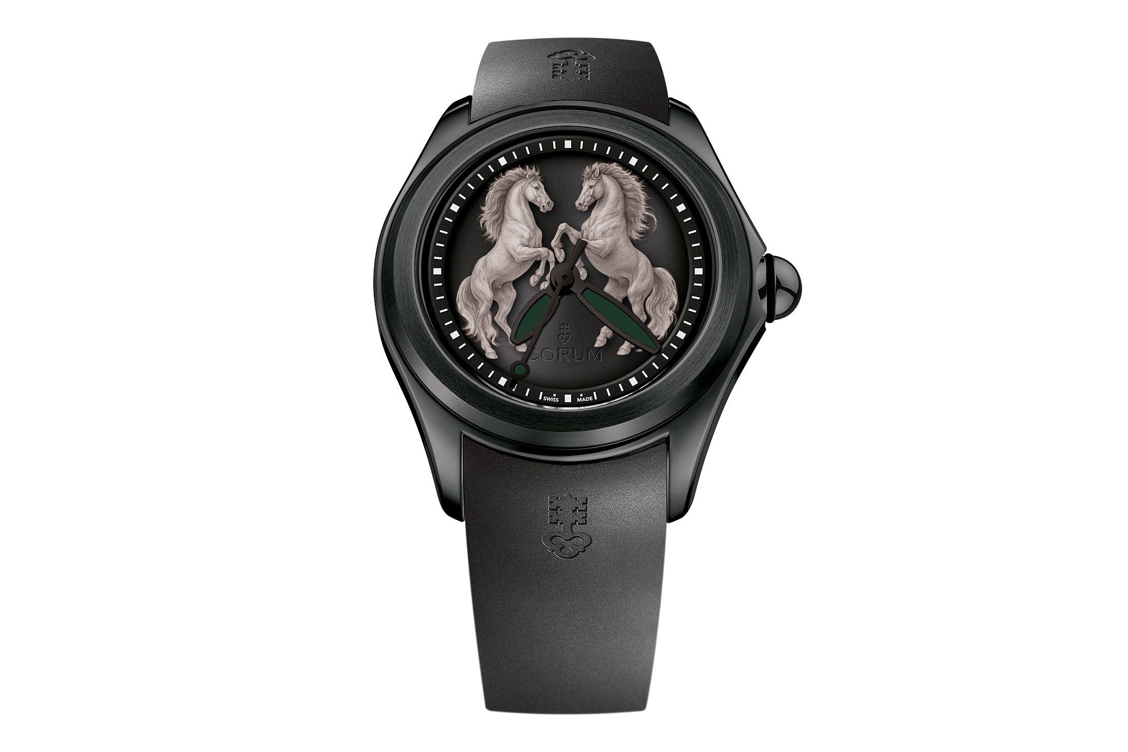 今回選んだのは、躍動感のある二頭の馬が文字盤に鎮座するモデル。ケース径は47mm、厚さは18.5mm。もはや時計というより、手首に載せるオブジェと言ったほうがしっくりくる。最大8mmもの厚みを持つドーム型サファイアガラスの下で、二頭の馬が楽しそうに前脚をあげている。しかもこの馬はスーパールミノバ仕様で、暗闇のなかでボディが白く光る。