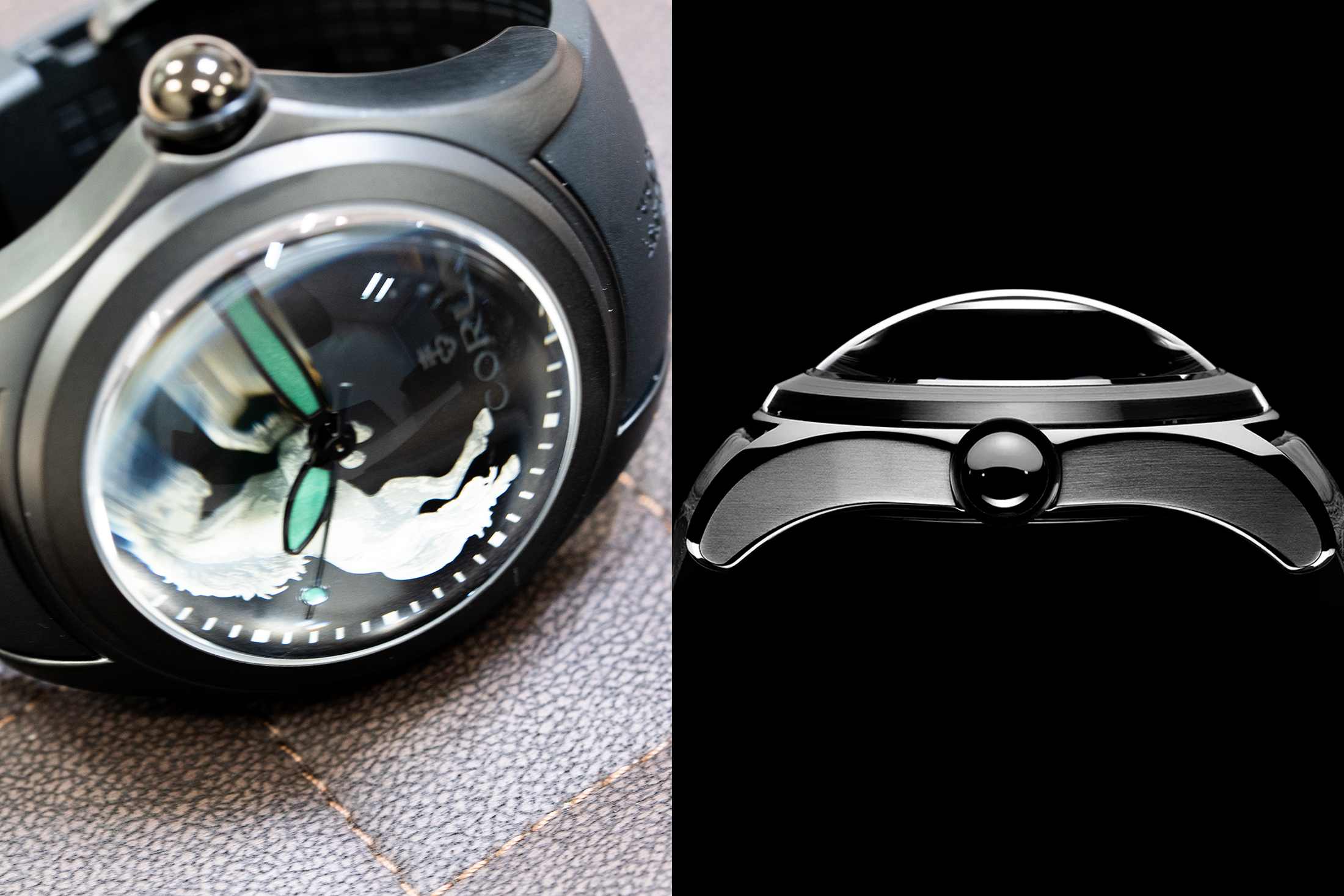 バブルコレクションが誕生したのは2000年。故セヴリン・ワンダーマンによって生み出され、そのあまりに大胆な造形は、当時の時計業界に少なからぬ衝撃を与えた。名前のとおり、泡のように盛り上がったドーム型サファイアクリスタルが最大の特徴だ。この分厚いガラスは単なる風防ではない。まるでレンズのように文字盤を歪ませ、拡大して見せる。視認性を良くするどころか、あえて歪ませるという発想。その姿勢は、時間を知るための道具というより、完全に楽しむためのオブジェだ。トランプやスカルなど、遊び心全開の文字盤が揃うのもバブルらしい魅力だろう。