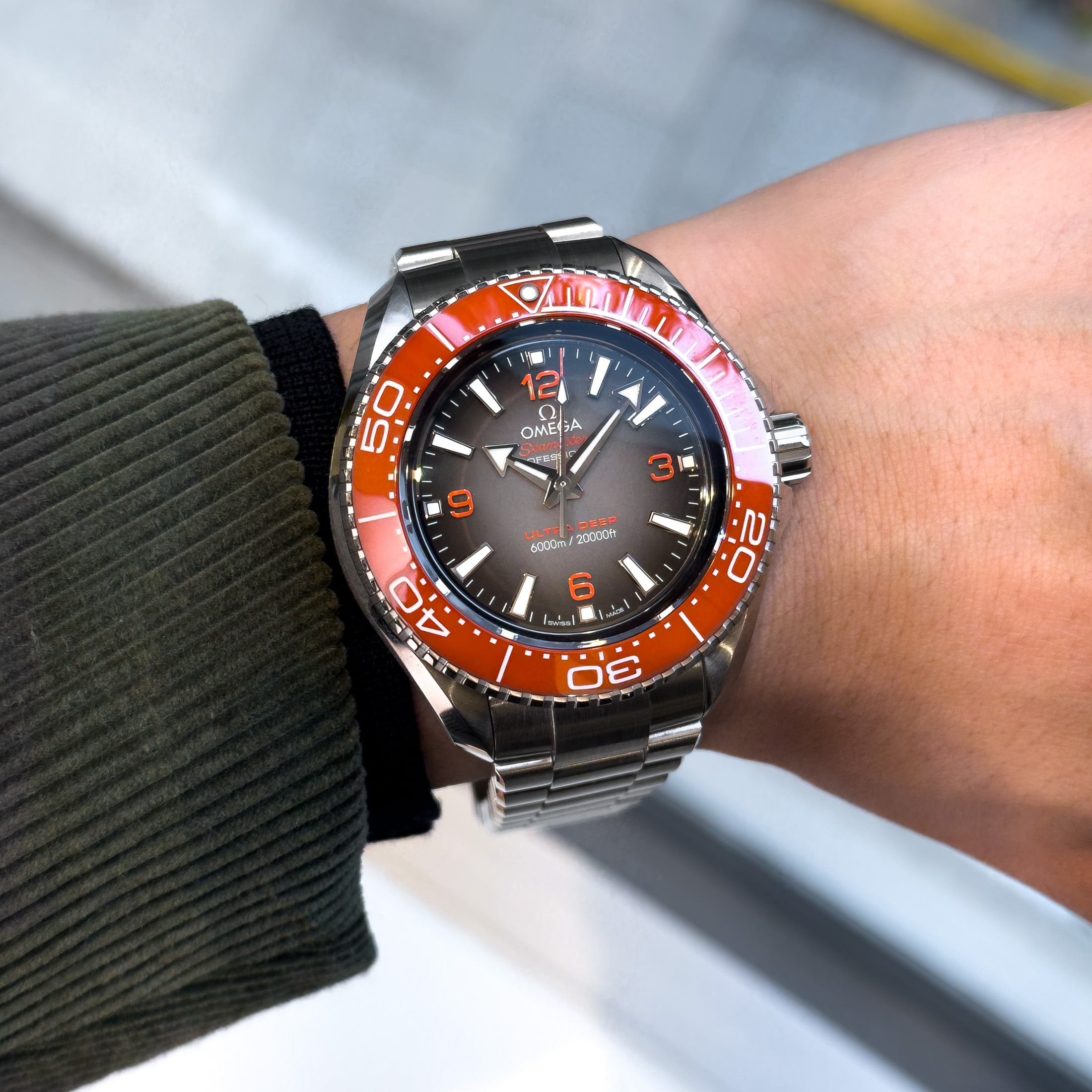 デカ厚時計と聞いて、まず思い浮かんだのがこの1本です。オメガのシーマスター プラネットオーシャン ウルトラディープ。直径45.5mm、厚さ18.12mmという圧倒的なサイズに、6000m防水というスペック。数字だけを見れば、日常使いとは無縁の存在にも思えます。
