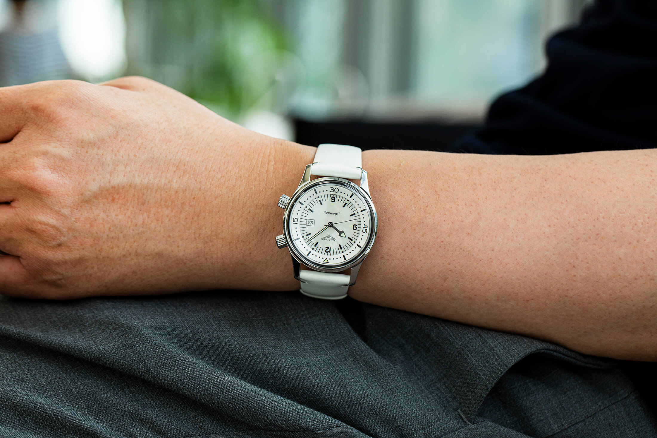 こちらの時計は、オールホワイトカラーでまとめたロンジンのレジェンドダイバーだ。サイズは36mm。公式サイトを見てみると、明確に女性向けとは言及していないものの、やはりレディスウォッチに分類されている。とはいえ、基本的なスタイルはスタンダードな42mmのレジェンドダイバーとまったく同じ。2つのリューズを備えたインナー回転ベゼルのクラシカルなダイバーズウォッチであり、すんなりつけることができた(ちなみに搭載ムーブメントは42mmモデルとは異なる)。