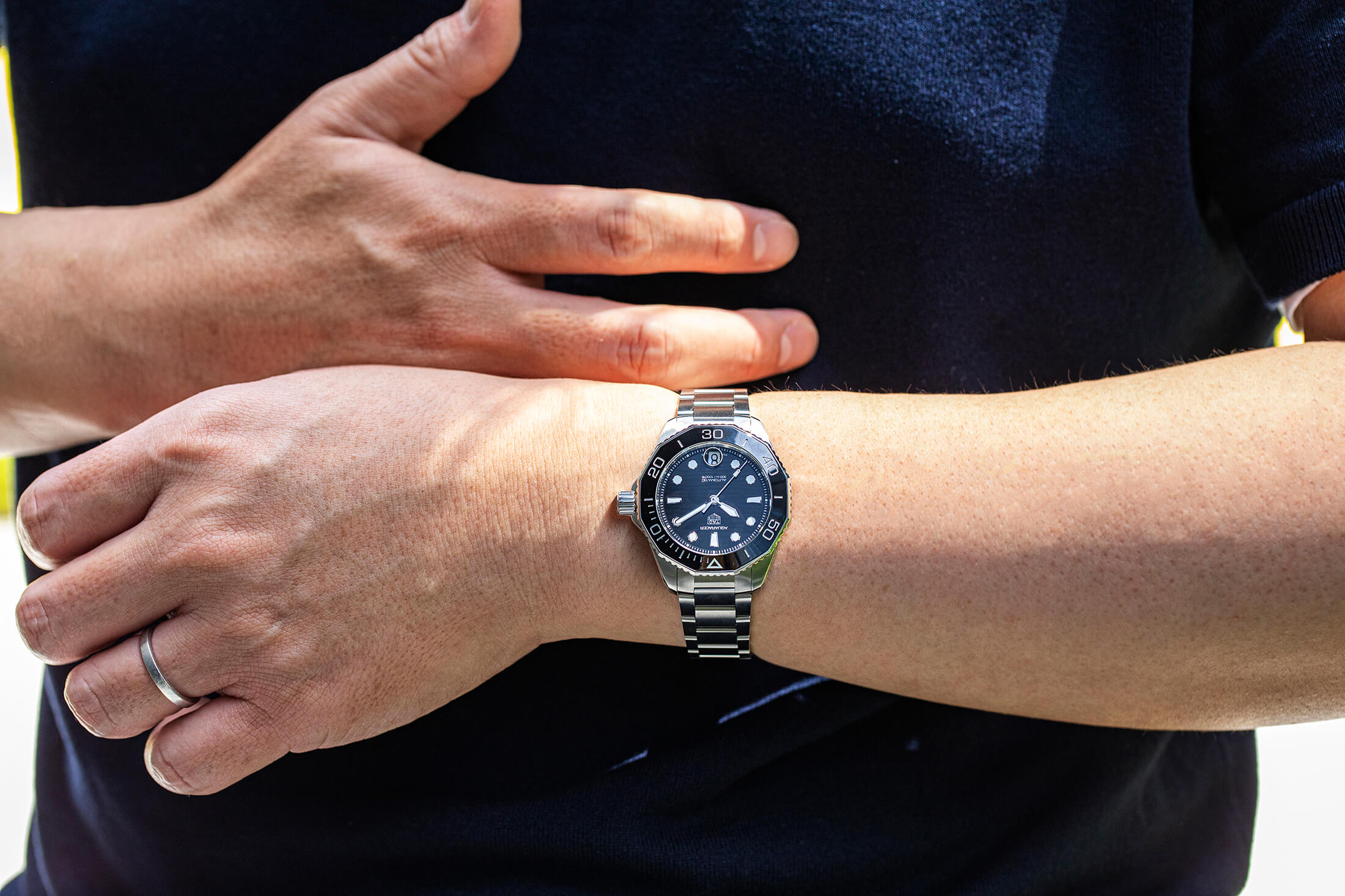 なかでも引かれたのが、タグ・ホイヤーが2021年の新作として投入したアクアレーサー プロフェッショナル300だ。43mmに加えて36mmもラインナップされており、ダイヤルデザインに若干の違いはあるがそれ以外に両者に大きな違いはない。どちらもセラミックベゼル、SSケースとブレスレットの現代的な外観で、防水性は300mと小さめサイズでも本格的。12角形ベゼルに8角形のインデックスを合わせ、36mmモデルはダイヤルには波模様の仕上げ(43mmモデルは水平パターン装飾)を施すなど、程よい遊び心を加えている。
