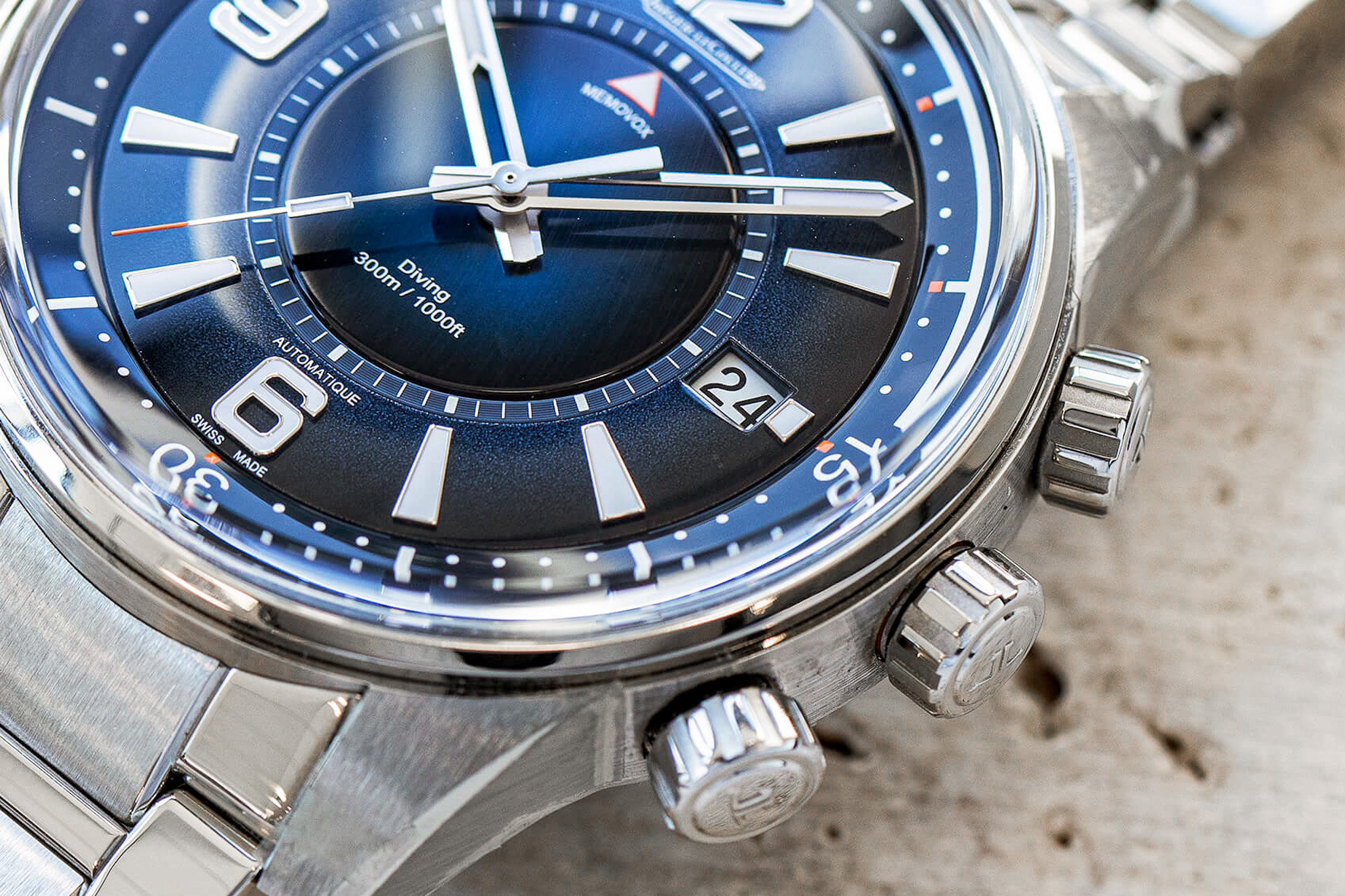 2時位置のリューズでアラーム時間をセット、3時位置のリューズでインナーベゼルを操作し、時刻設定は4時位置のリューズで行う。
