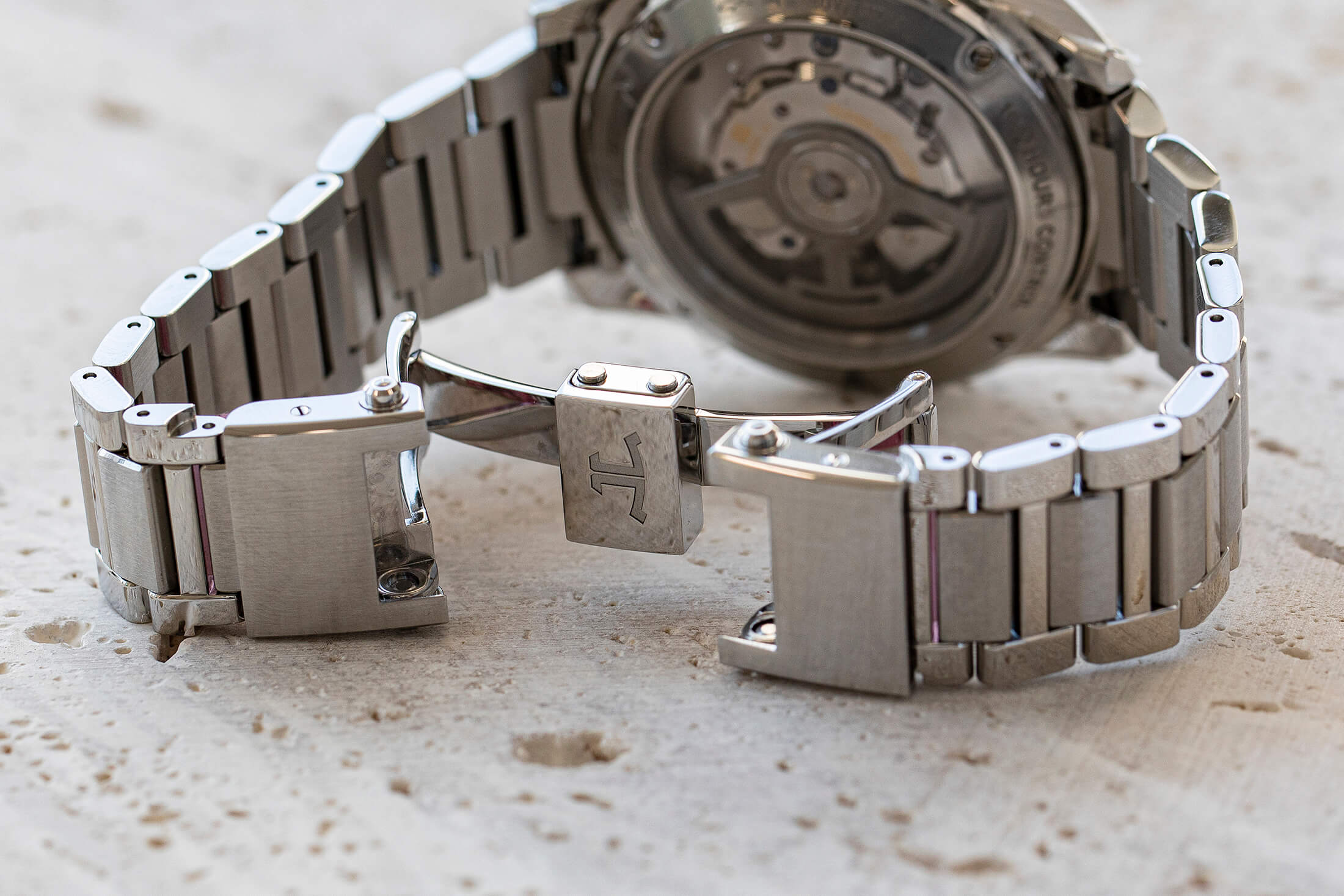 サテン仕上げと鏡面仕上げを組み合わせた直径42mmのステンレススティール製ケースとブレスレットを備えた本機は、オリジナルデザインを継承しながら、大きくアップデートされています。防水性能は30気圧に高められ、初めてトランスパレントケースバックが与えられました。内部に搭載するのは、2008年に発表されたCal.956。これまでの同キャリバーは、クローズドケースバックにワイヤー式ゴングが取り付けられる形でしたが、トランスパレント化に伴いゴングをケース側に取り付ける新設計となっています。