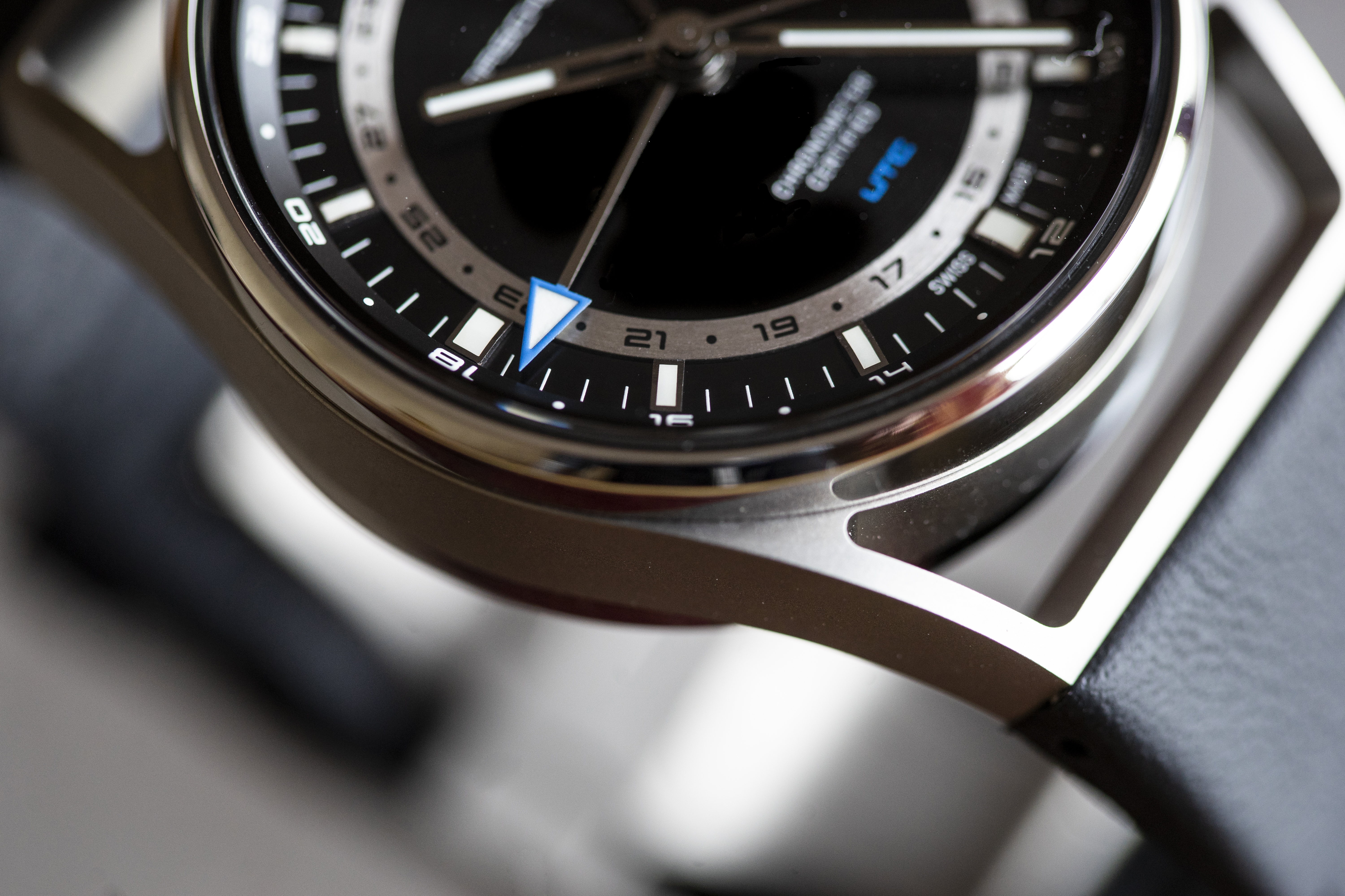 ポルシェデザイン・スタジオのローランド・ハイラー(Roland Heiler)代表取締役社長とポルシェデザイン・タイムピースのゲルハルト・ノバク(Gerhard Novak)部長、それに私も交えて、昨年ポルシェデザイン・スタジオで時計について語り合った。2019年にポルシェデザインがもたらした大きなニュースが、「1919 グローブタイマー UTC」だった。42mmのケースには、ストラップ装着用の大きな開口部を備えたモノブロックケースが用いられている。東へ旅する場合は、上のボタンを押すだけで時間を1時間進めることができ、スケジュール通りに西の方へと帰ってくる場合は、下のボタンを押す。日付変更線をまたいだ場合は、ありがたいことに日付表示も自動で追従してくれる。