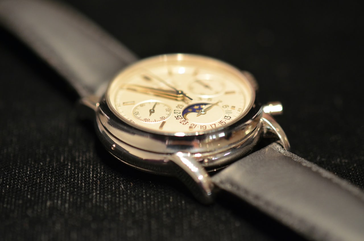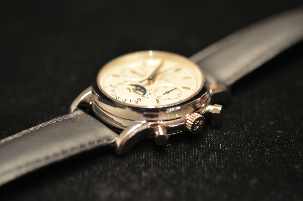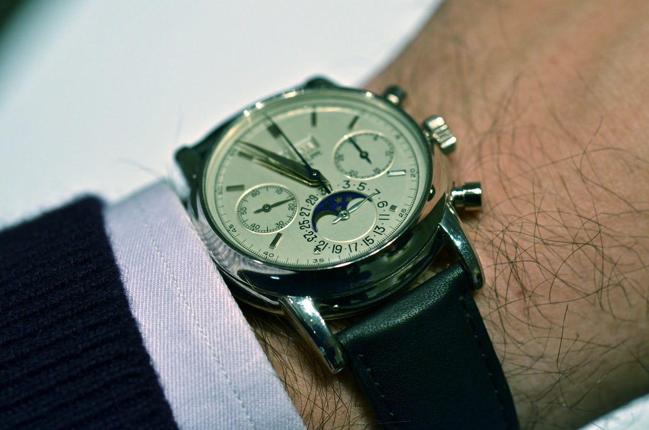金曜日にクリスティーズを訪れたとき、私がどれだけはしゃいだか知っているか? まさに夢のようだった。時計は、客観的に( “客観的に”が何を意味するのかは緩く解釈してくれ)見て、ただただ素晴らしかった。パテックのパーペチュアルカレンダー・クロノグラフは、間違いなく地球上で最も私のお気に入りの時計である(実際のところ、私は1本も所有していないが)。ホワイトメタルのヴィンテージモデルでありながら、ロックスターの名を冠しているという事実は、とても素晴らしいものだ。そして、実際にストラップを着けてみると(実際に着用したんだ!)、ぴったりと収まる。ケースサイズ37.5mmは私の理想的なサイズかもしれない。Ref.3970の36mmよりも大きいが、Ref.5970の39mmよりも小さく、円形のポンププッシャーを備えている。最近ある人が私に指摘したとおり、最高に素晴らしい時計である。