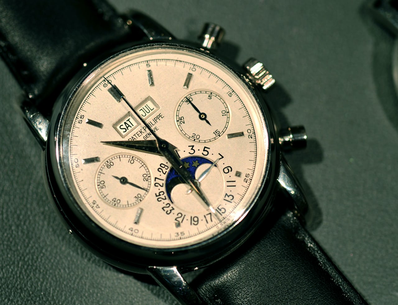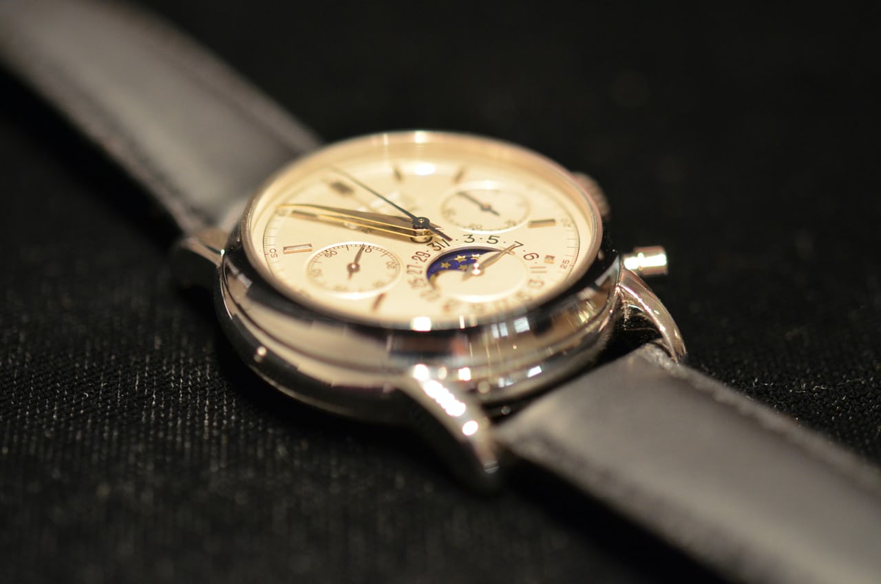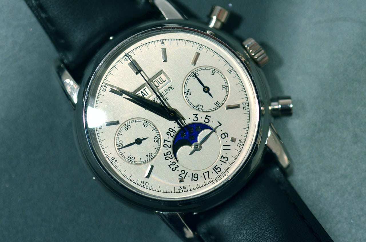 金曜日にクリスティーズを訪れたとき、私がどれだけはしゃいだか知っているか? まさに夢のようだった。時計は、客観的に( “客観的に”が何を意味するのかは緩く解釈してくれ)見て、ただただ素晴らしかった。パテックのパーペチュアルカレンダー・クロノグラフは、間違いなく地球上で最も私のお気に入りの時計である(実際のところ、私は1本も所有していないが)。ホワイトメタルのヴィンテージモデルでありながら、ロックスターの名を冠しているという事実は、とても素晴らしいものだ。そして、実際にストラップを着けてみると(実際に着用したんだ!)、ぴったりと収まる。ケースサイズ37.5mmは私の理想的なサイズかもしれない。Ref.3970の36mmよりも大きいが、Ref.5970の39mmよりも小さく、円形のポンププッシャーを備えている。最近ある人が私に指摘したとおり、最高に素晴らしい時計である。