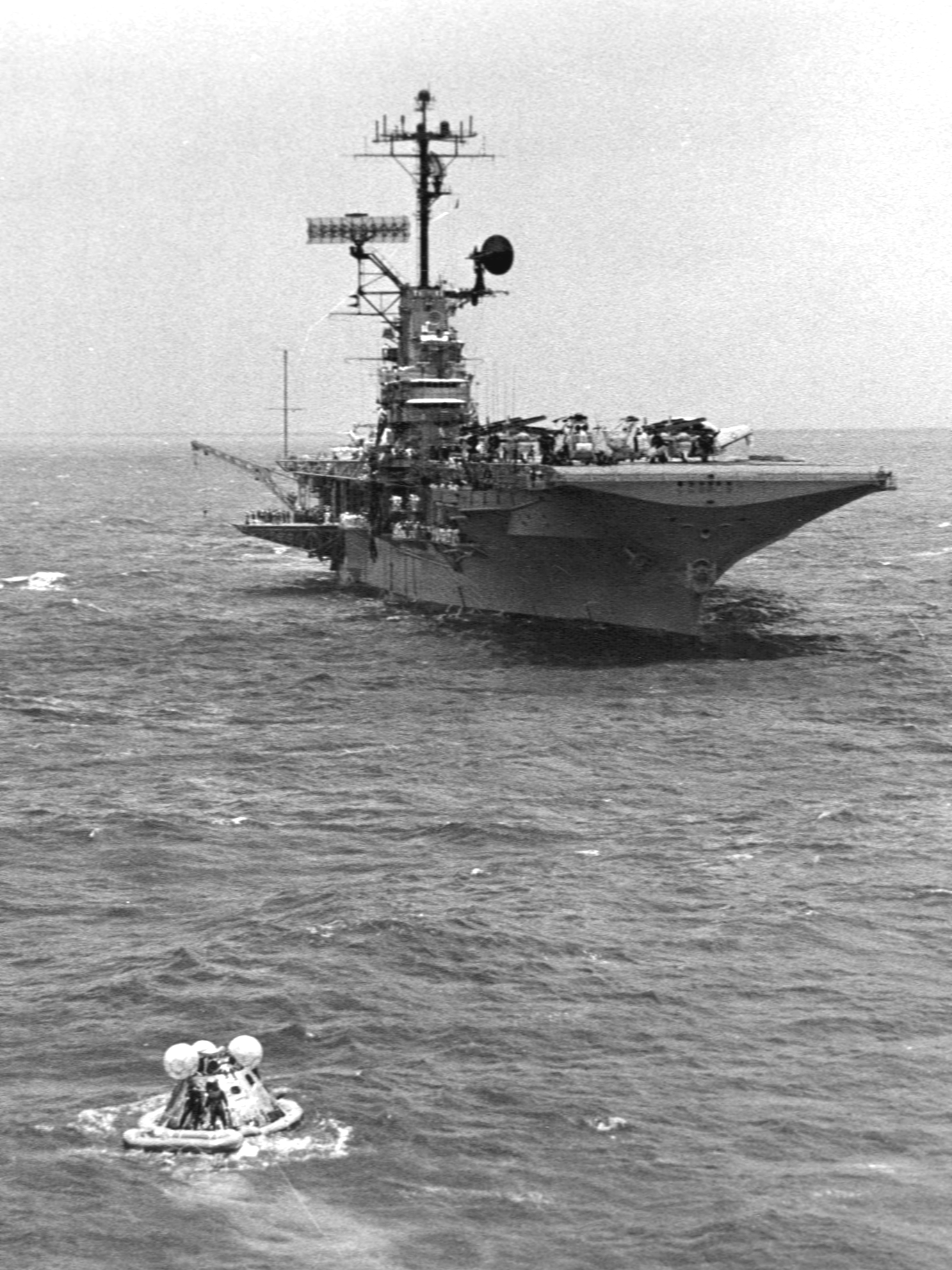 第二次世界大戦に参戦したアメリカ軍空母ホーネットが、アポロ11号の司令船「コロンビア」を回収する様子。1969年7月。