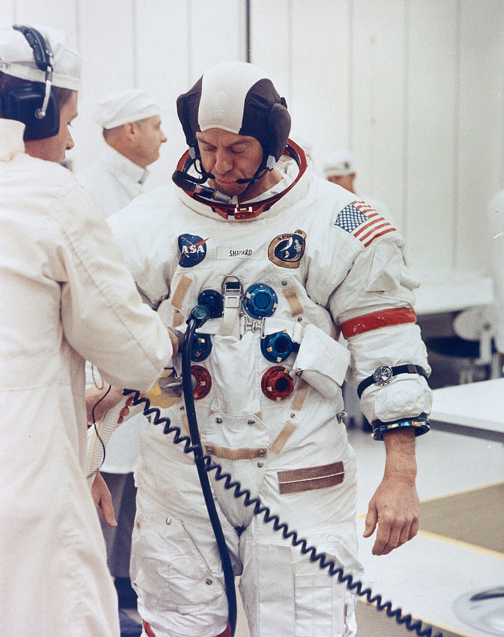 アポロ14号の発射前、宇宙飛行士のアラン・シェパードが宇宙服を着用している様子。腕に着けているのはスピードマスター。