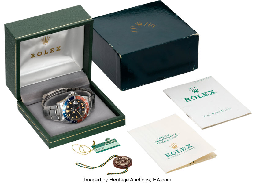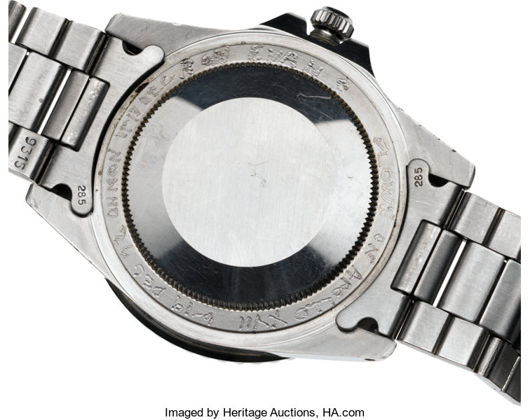 確かにかなりの数のGMTマスターがさまざまなアポロ計画(アポロ14の3人の乗組員全員を含む)で宇宙飛行したが、GMTマスターが月面にいたという明確な証拠を見つけることは少し難しい(例えば、ルーサはアポロ14号のCSMパイロットであったため、彼の時計は飛行中に月の実際の表面に到達しなかった)。いずれにせよ、エヴァンスの時計は、これまでオークションに登場した唯一のGMTマスターだ。