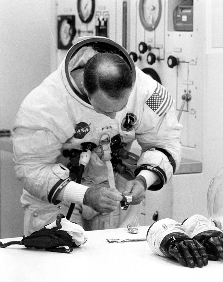 アポロ14号ミッション、宇宙服の準備中に自身のロレックスGMTマスターを合わせる月着陸船操縦士のエドガー・ミッチェル、1971年。