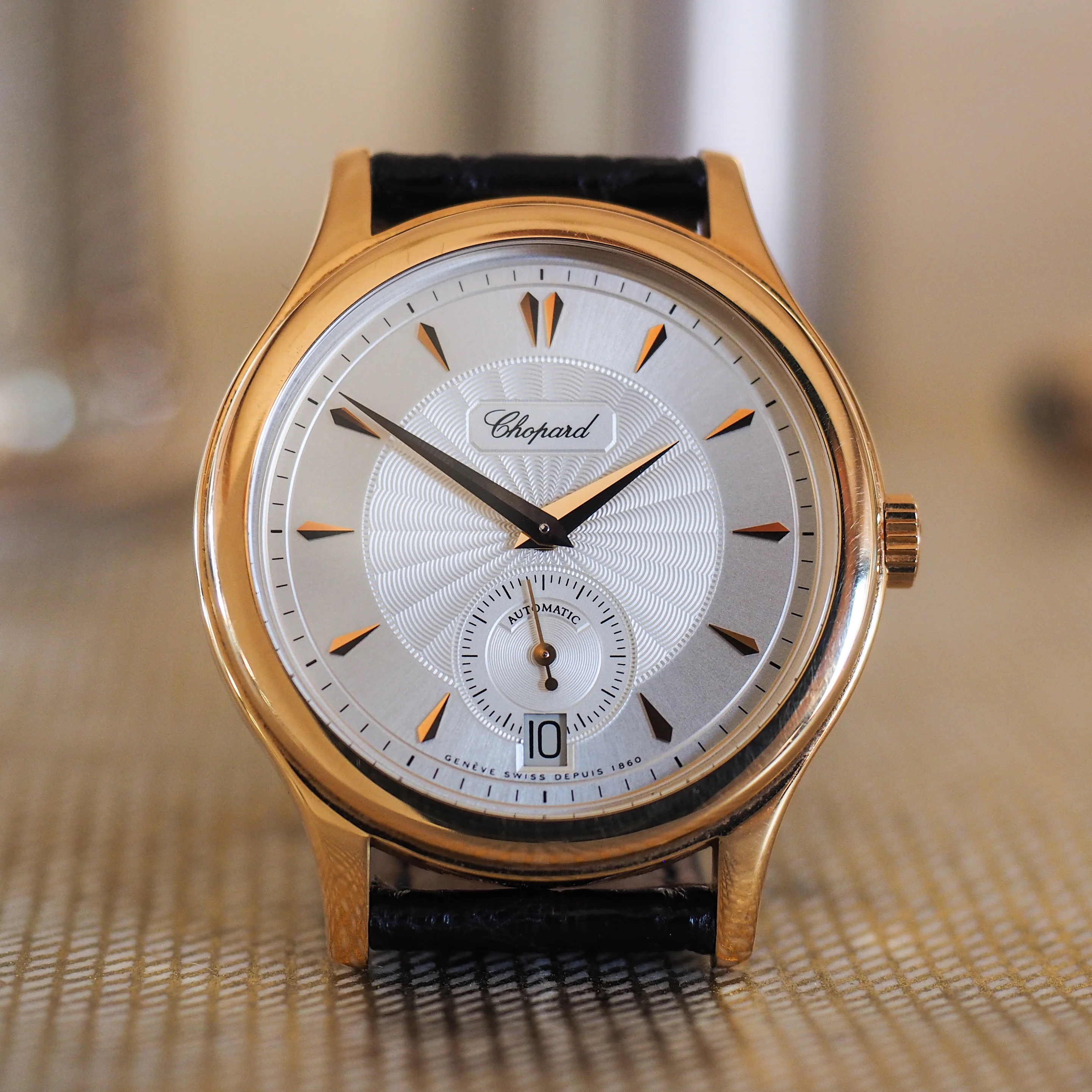 ファーストシリーズとなるL.U.C 1860のダイヤルは、フィリップ・デュフォーのシンプリシティ(編集部注:L.U.C 1860が先行!)のダイヤルを手がけたことで知られる専業メーカー、メタレム社が製作した。このダイヤルの美しさときたらどんな皮肉屋でも、旋盤で加工されたギヨシェを見つめている一瞬のあいだだけはロマンチストになれるかもしれないほどだ。貴金属製のケースは36mmで、ベゼルにはわずかに段差が設けられている。デイト表示についてとやかくいう人もいるだろうが、6時位置に絶妙に配置されており、これがL.U.C 1860の魅力を損なっているとは思えない(しかし、デイト表示は邪道だ! という病に冒された人のために、ショパールはデイト表示のないダイヤルを試作し、Cal.1.96のノンデイト版と組み合わせたという話もある。結局、このムーブメントは生産されなかったが)。