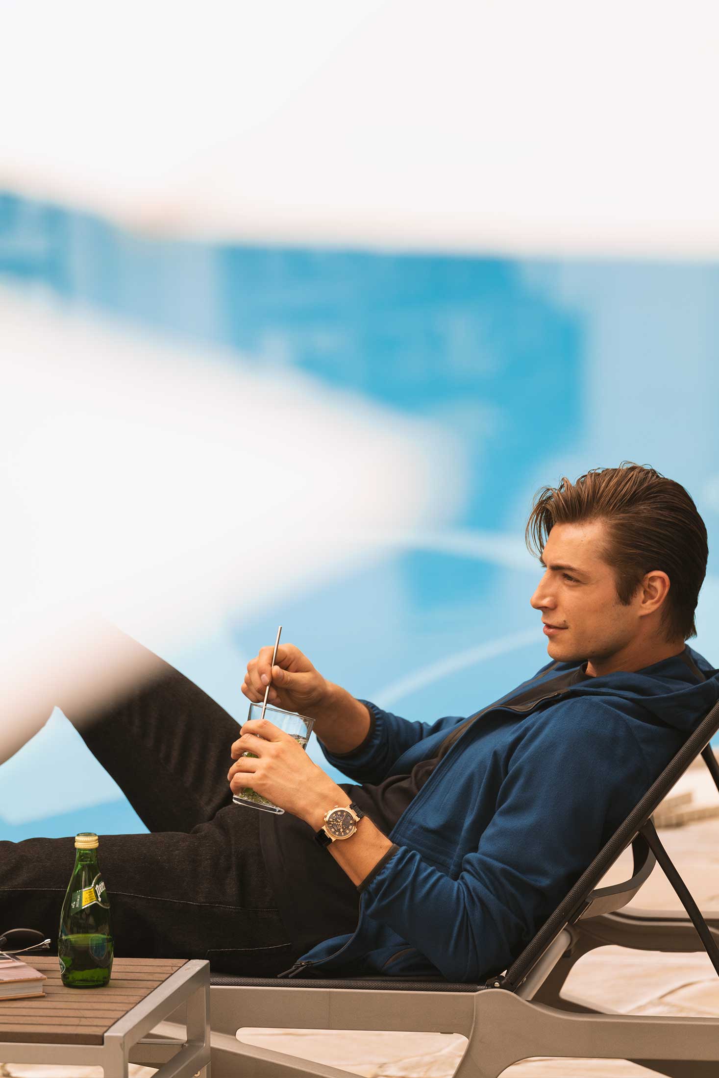 喧騒から離れたリゾートや豊かな自然環境で過ごすワーケーションの醍醐味は、心身をリラックスさせつつ、いかに意識を研ぎ澄ませるか。それは間断ない日常では得難い、新しいワークライフバランスだ。そんな時間をマリーンのRGモデルが静かに刻む。ゴージャスなRGケースに対し、スレートグレイダイヤルは都会的な雰囲気を醸し出し、そのコントラストにエレガンスが漂う。とくにアラーム ミュージカル 5547は、トラベルユースにも実用的な第2時間帯表示に加え、アラーム機構を備える。右のサブダイヤルと4時位置のリューズで時刻を設定し、8時位置のプッシュでオン/オフを簡単に操作でき、タイムスケジュールに合わせて使えば、心地よい音色に気分も切り替わるだろう。創造性や集中力を高め、新たな発見や気づきにもつながるに違いない。