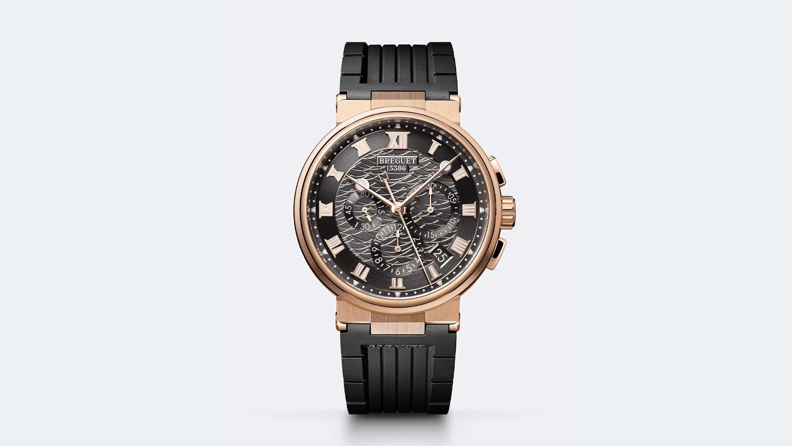 初代アブラアン-ルイ・ブレゲは、1815年にフランス国王ルイ18世から王国海軍時計師の称号を授けられた。この歴史に着想を得て1990年にマリーンは誕生。以降熟成を重ね、2018年に現在の第3世代へと進化を遂げた。伝統的なクラシックスタイルと、独創的な先進技術を併せもつブレゲの個性に、スポーティなマリンテイストが溢れる。とくにゴールドケースの、派手さを控えたシックな気品は唯一無二であり、スレートグレイダイヤルを合わせることでさらに現代的な魅力を増し、幅広いシーンにも映える。そしてダイヤル中央に刻まれた波模様のギヨシェ装飾が、変わることのない航海への冒険心をかき立てるのだ。