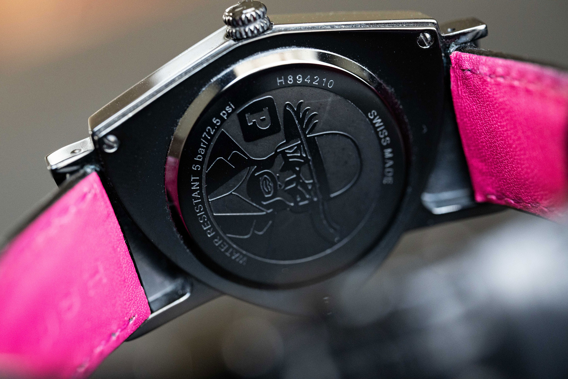 本機はポギー氏のプレスリー好きを知ったハミルトンが、別注企画のオファーをしたことで実現。前身を黒で統一しながら自身が手掛けるキュレーションブランド「POGGYTHEMAN」のロゴがケースバックに。ストラップ裏面にピンクを配したのは、プレスリーがデビュー当時に地元で初めて仕立てたピンクのスーツに由来するという。