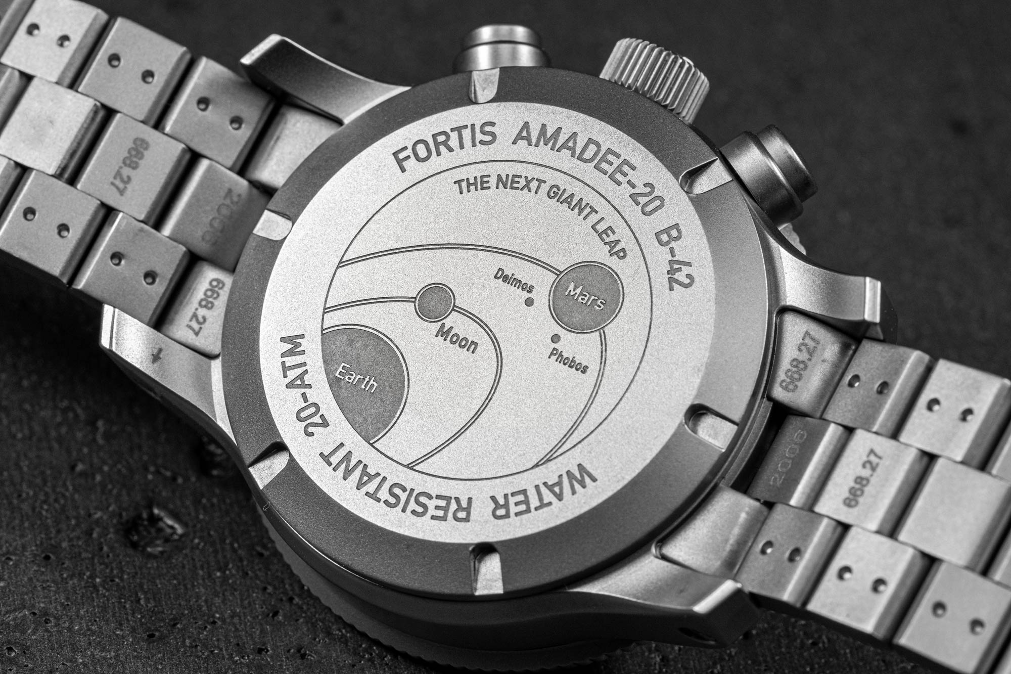 フォルティスのアマディ20 クロノグラフは、宇宙開発と現代の時計の接点において、興味深い位置を占めている。NASAやROSCOSMOSの標準的な時計は、スピードマスター、スピードマスターX-33、フォルティス初のオフィシャル・コスモノート・クロノグラフ、フォルティスB-42の初期モデルなどがあるが、アマディ20は全くの別物だ。アマディ20は、オーストリア宇宙フォーラムと共同で開発された、火星での使用を想定したミッション専用の時計だ。スピードマスター(自動車レースと月面探査)のように、ある目的のために設計され、別の目的のためにも使用されるという時計ではないのだ。この時計は、エンドユーザーであるアストロノーツやコスモノーツを念頭に置いて、一から作られたものなのだ。