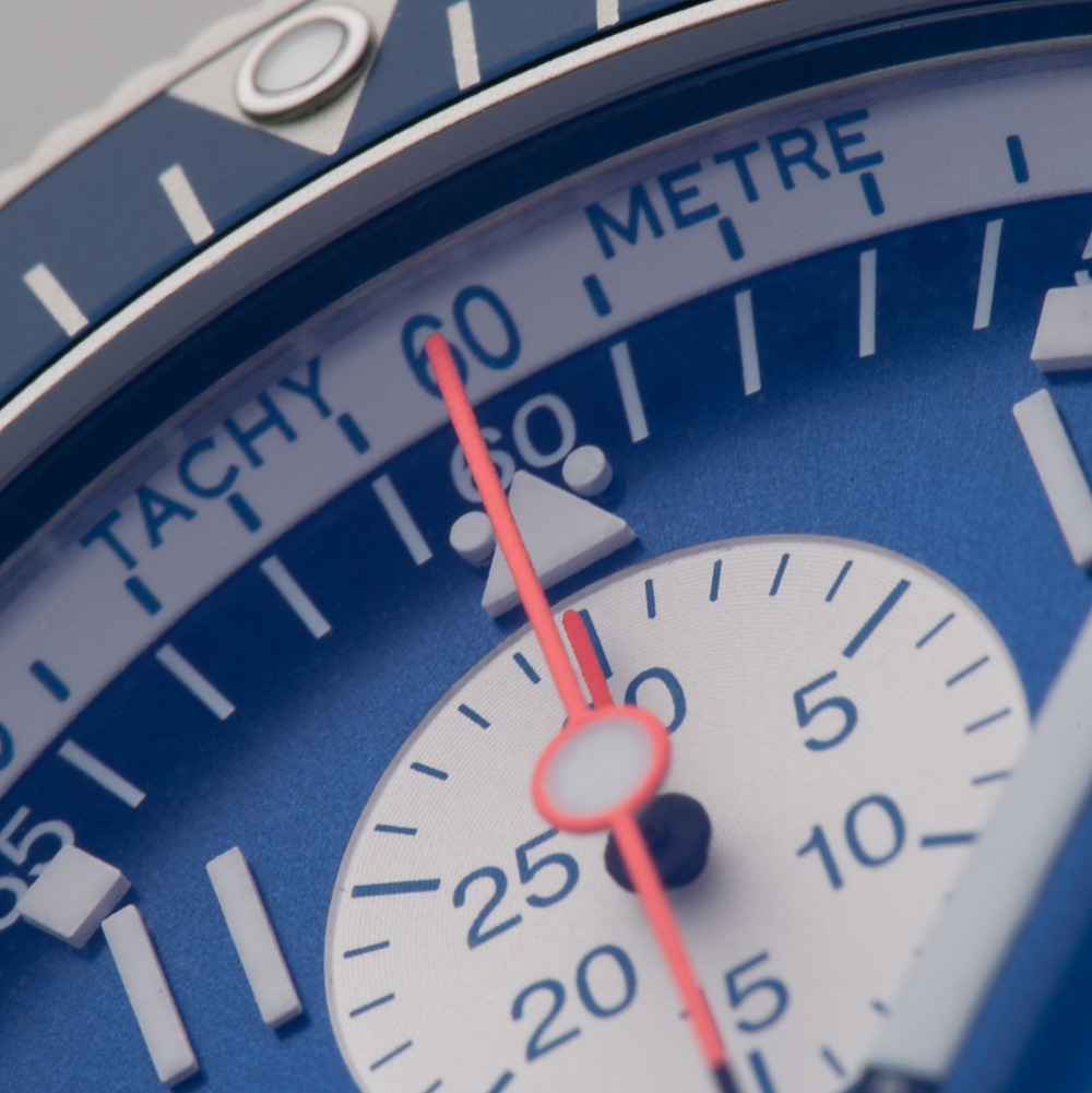 638ブルーインパルスは、ブルーダイヤルを有した3レジスタークロノグラフです。特徴的なブルーの逆回転防止ベゼルのすぐ内側には、白地の細いタキメータースケールが配されています。文字盤上は、12時位置に30分積算計、6時位置に12時間計があり、9時位置にはブルーインパルスのロゴマークを用いたスモールセコンドを表示。ロゴマーク以外のサブダイヤルはコントラストの高いホワイトで視認性を向上しています。