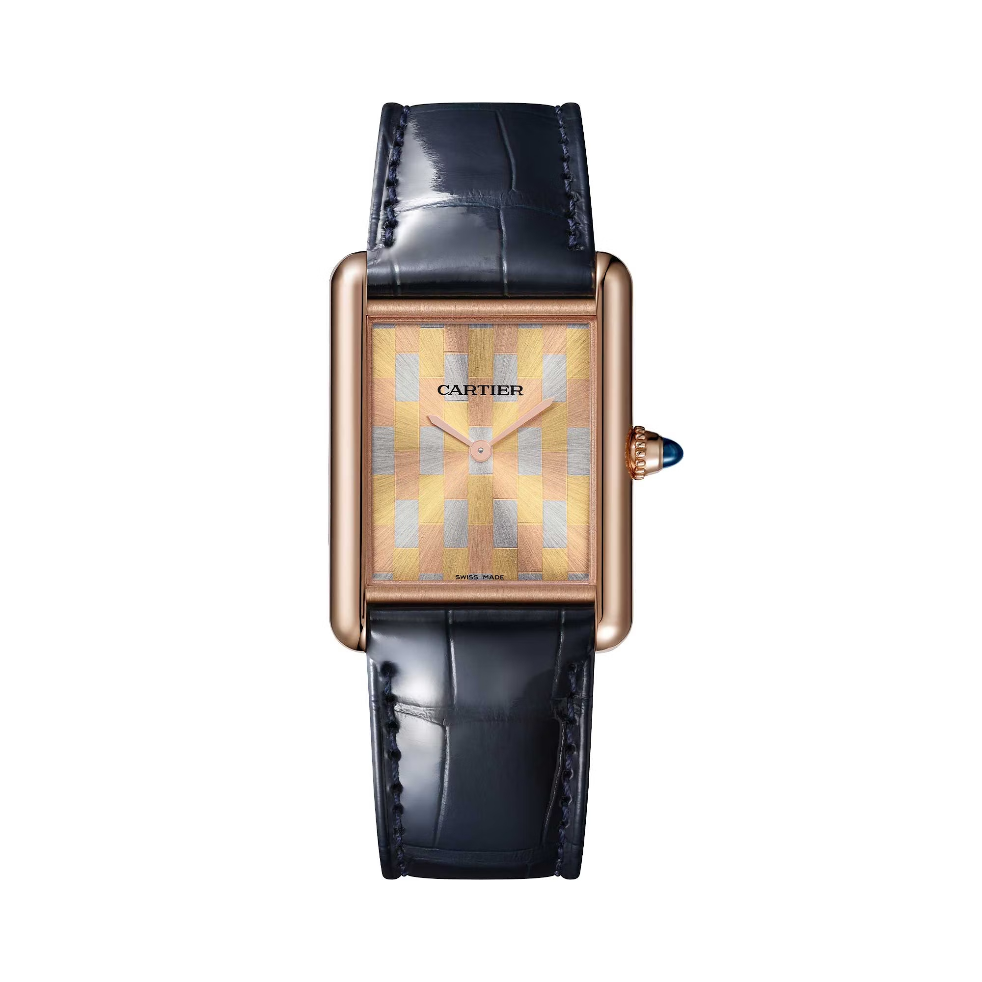 独自性を打ち出しているのは文字盤の色や模様、ストラップなどだ。ボルドーレッドとグリーンの2色のラッカー仕上げのモデル(お揃いのアリゲーターストラップがセット)があり、こちらに装飾は一切ない。ただしゴールドをモチーフにしたオプションでは、少しグラフィックアート的に仕上がっている。カルティエによると、これらの時計は1970年代に誕生した、「レ マスト」のデザインに敬意を表しているそうだ。「トリニティ」の100周年を記念して3色のゴールドが使用されたダイヤルは、トライゴールドの小さな四角形はディスコボール、スリーゴールドの大きなホワイトゴールドの四角形はライトアップされたディスコフロアを連想させるなど、紛れもなく70年代の雰囲気を醸し出している。