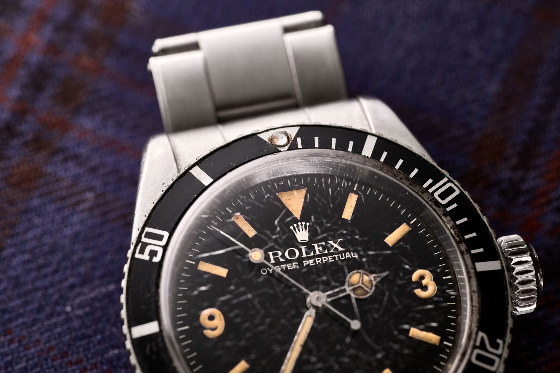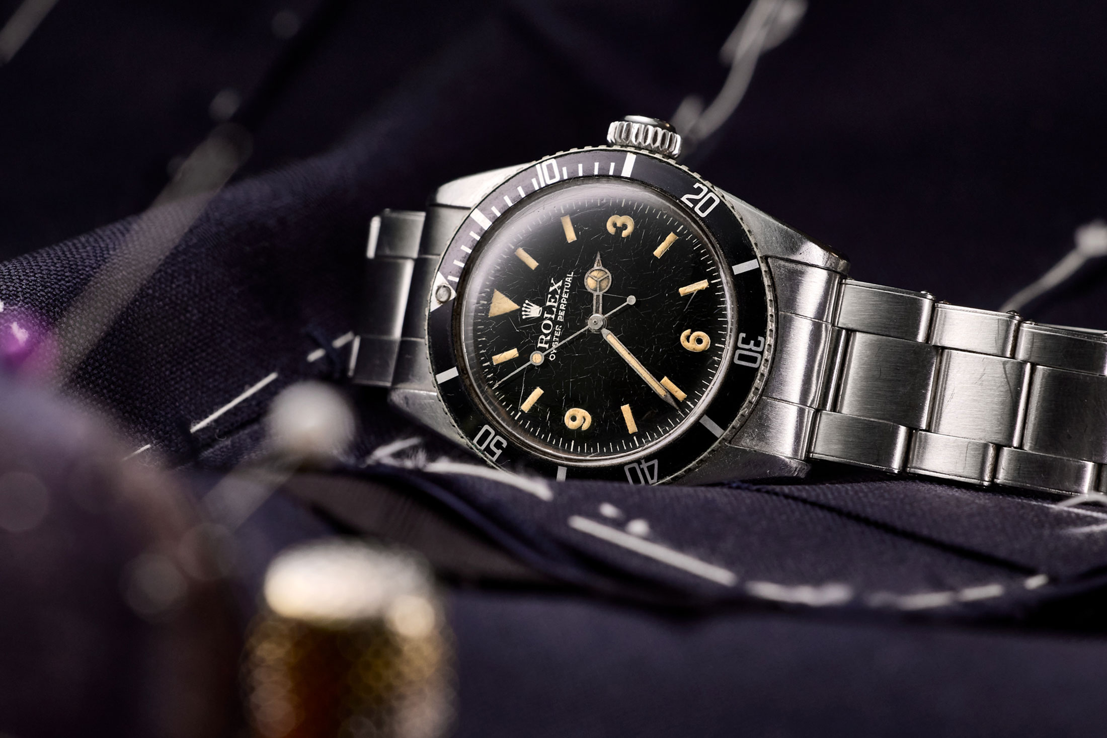 キング・オブ・サブマリーナーと称されるRef.6200には謎に包まれた部分も多い。小山氏も偶然手にした聖杯の神秘を探究すべくリサーチを続けてきたが、それでも未解明の部分は少なくないそうだ。「最も大きなミステリーは、1953年に発表された初代サブマリーナー Ref.6204より後に発売されたモデルにもかかわらず、リファレンスナンバーが若いことです。ちなみにRef.6200の製造期間は1954〜55年などと言われていますが、この個体はシリアルナンバーから1958年製ということが判明しています。巷ではRef.6204の前から企画自体は進んでいて、発売に至るまでに時間がかかってしまったことが理由ともされており、僕もこの説を支持します。個人的に付け加えるならば、Ref.6200はもともと軍向けに企画されたプロトタイプだったのではないかということ。3・6・9のダイヤルは同時期に製作されたオメガのシーマスターなど、当時の軍用時計にしばしば見られる仕様で、それゆえエクスプローラーダイヤルのサブマリーナーという珍奇なモデルが生まれたのでは……Ref.6200の防水性は200mとも言われていますが、そんなハイスペックを採用したのも軍向けであったことが理由なのかも。エビデンスのない憶測に過ぎませんけどね」