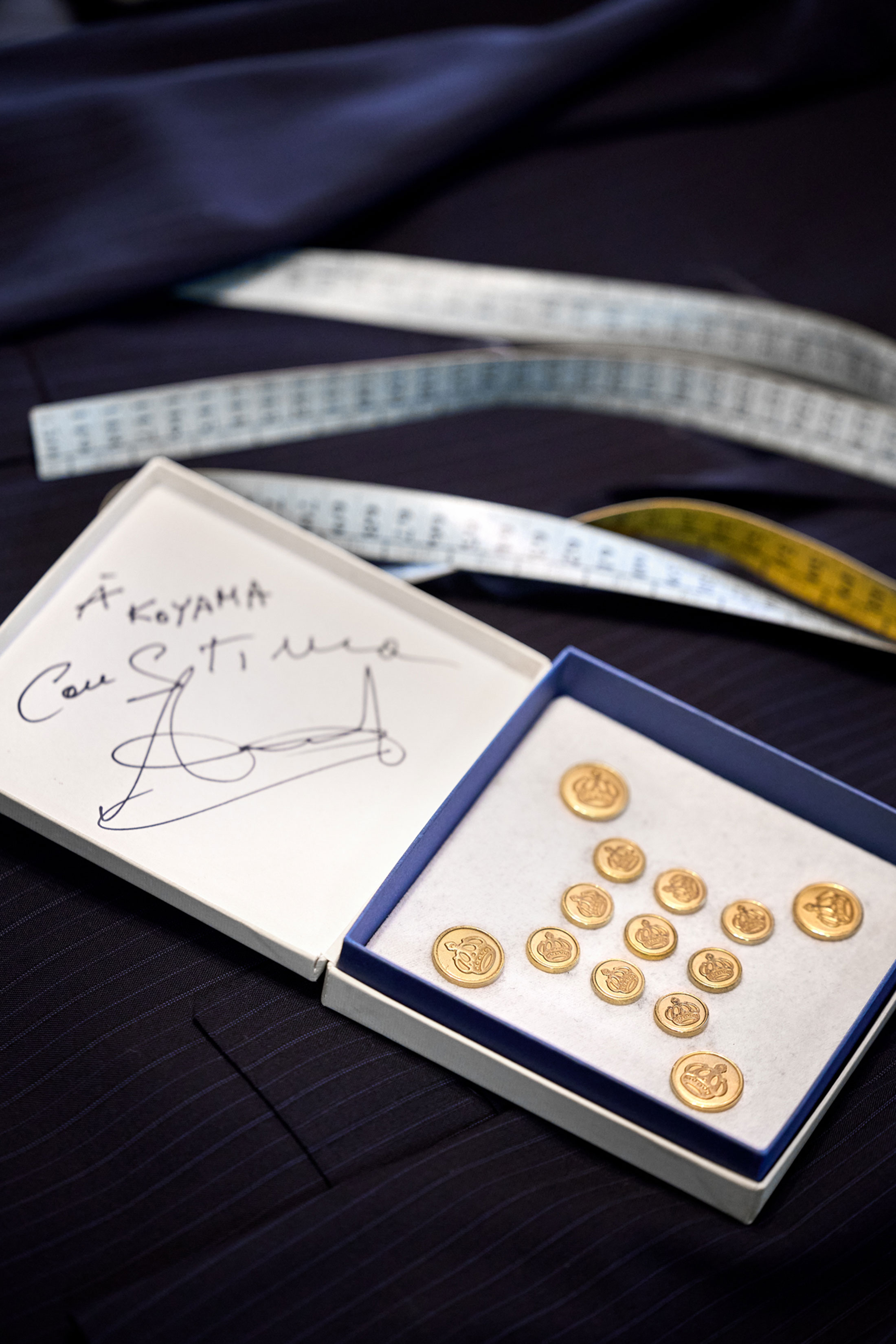 サルトリア ヤマッチの裁断台にはすぐ横に壁があり、そこには小山氏とパニコ氏のツーショット写真が針で留められている。ふたりの特別な絆を感じさせる一枚だ。+Oneとして小山氏が選んだのも、心の師パニコにまつわる思い出の品だった。「パニコの日本直営店は『サルトリア サロット』という名前だったのですが、そのオープン記念時にノベルティとして製作したメタルボタンセットです。パニコの紋章である王冠をあしらったものですが、日本で企画製作したものなのでナポリでは手に入りません。僕もこの1セットしか所有していないので、もったいなくて使えないですね。蓋の内側にはパニコさんのサインがあります」