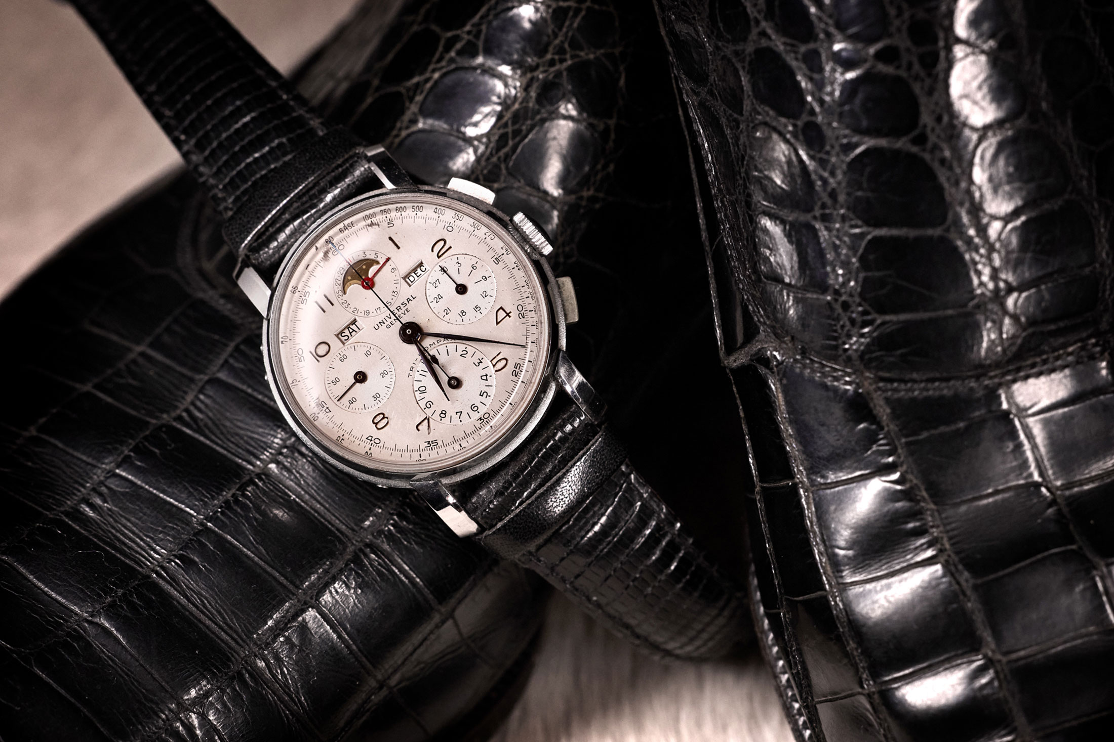 上記のとおりミリタリーダイバーズを愛好する小山氏にとって、こちらは異色の一本だという。「ボンドに倣って普段のスーツスタイルにはダイバーズを合わせていましたが、冠婚葬祭など改まった場所ではそうもいかないと思ってコレクションに加えました。せっかくならば全く個性の違うものをと思って、ドリプルカレンダー・ムーンフェイズ・クロノグラフを搭載した複雑機構を狙うことにしたんです。ユニバーサル・ジュネーブというブランドを選んだのは特に深い理由もなく、当時(2003年ごろ)の勤務先であるビームスで販売していたヴィンテージラインナップのなかでデザインが気に入ったものを手に取ったという次第です」と小山氏は話すが、奇しくも同社は2026年の再始動に向けて目下、熱を帯びているブランド。氏には名機を本能的に見分ける特別な能力があるのかもしれない。