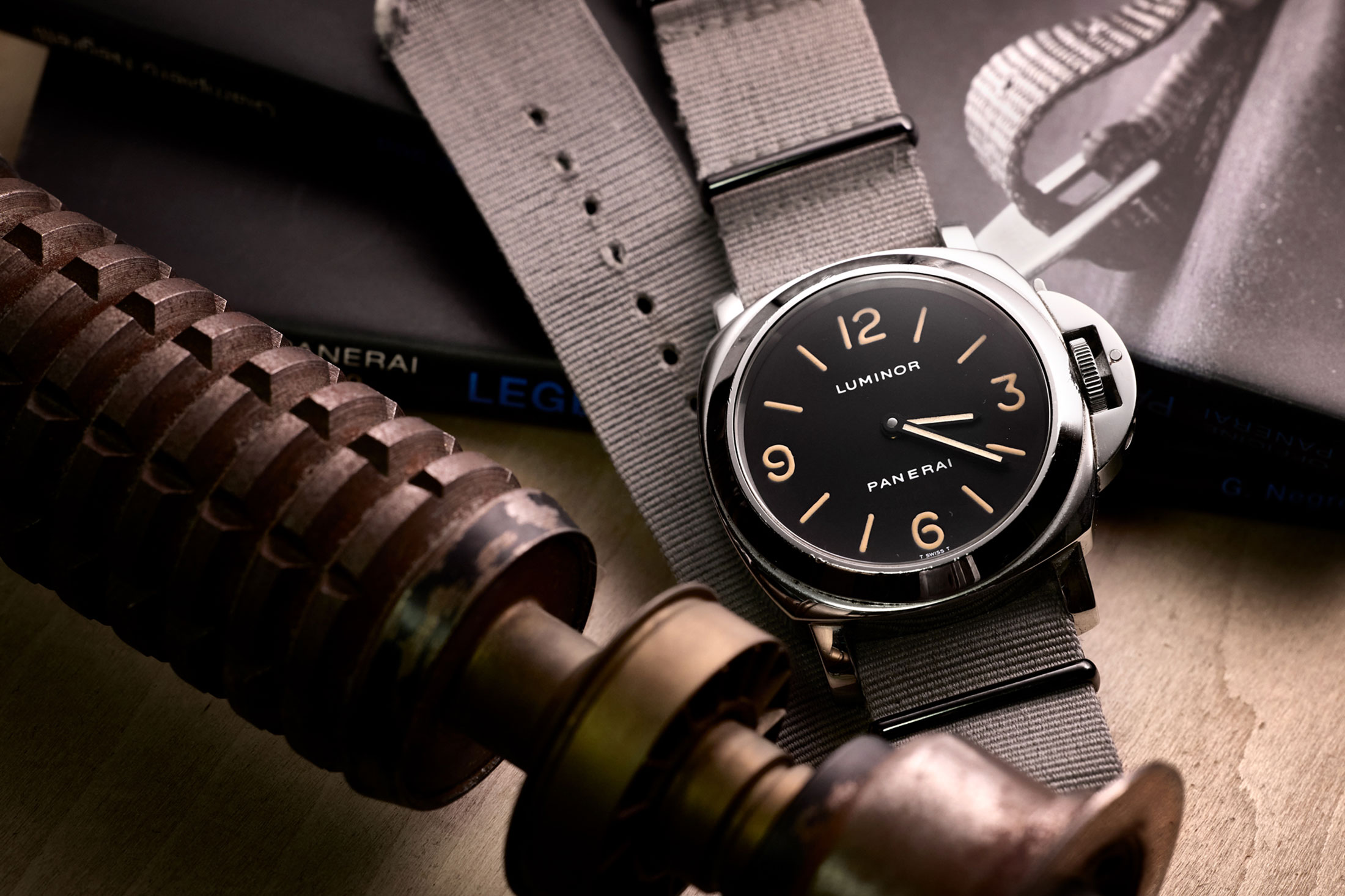 ボンドへの憧れからサブマリーナーを手にしつつ、ミリタリーダイバーズを象徴する一本としてパネライのルミノールにも思いを募らせていたという小山氏。「軍用時計をコレクションした本に掲載されていたのを見てひと目惚れしたんです。とはいえ当時はヴィンテージでしか入手する方法がなく、津田沼にあるミリタリーショップで実物を目にしたことがあるのですが、サビだらけの状態で購入には至りませんでした。ただ、あれを今持っていたらすごい値打ちものになっていかも……後の祭りですね。ショップで実物を目にしても状態が気になって購入には至りませんでした。それだけに、1997年にブランドがリシュモングループへ参加し、日本でも新品が買えるようになったというニュースを聞いたときは飛び上がりました。当時はカルティエのブティックで取り扱っていたので、店頭へ走りましたね。ただ、ここでひとつ問題が。僕はブラウンのレザーストラップが装着されたRef.PAM00002が欲しかったのですが、目当てのストラップはスモールセコンド付きのRef.PAM00001にしか採用されていませんでした。ストラップ単品を購入できないかと訊ねたのですが取り付く島もなかったので、悩んだ挙句Ref.PAM00002とRef.PAM00001を2本買いすることにしたんです。ちょっと普通ではないですかね。薄型小径が主流の昨今ですが、僕は今でも軍用由来の厚みのある時計に魅力を感じます。ちなみに当時のストラップですが、ウェットスーツの上から巻く設計が踏襲されていたため、一番短い穴にバックルを通してもブカブカの状態。お店で穴を追加してほしいと頼んだのですが、楕円形の特殊な穴なので無理と言われてしまい、仕方なく自分で穴を追加した記憶があります。その後、ビームスでもパネライを取り扱うことが決まり、所有者だったこともあってパネライ担当を仰せつかりました。そんなエピソードもあって、デカ厚ブームが過ぎた今も特別な愛着を感じる一本です」