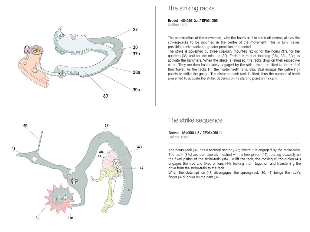 時と分をダイヤル中央から外したムーブメントのレイアウトにより、ソヌリ用の歯ザオを、ムーブメントの中心に取り付けることができる。これにより、精度と制動性を高めるための大型の歯ザオの搭載が可能となった。ソヌリは、同軸上に取り付けられた3つの歯ザオによって制御される:時単位用(37)、15分単位用(38)、そして分単位用(39)である。それぞれの歯ザオには、ハンマーを作動させるためのラチェット歯(37a,38a,39a)が付いている。ソヌリが作動すると、歯ザオは、それぞれのカムにドロップする。歯ザオは、即座にソヌリ用輪列と噛み合いながら、リフトされる。歯ザオがリフトされると、そのラチェット歯(37a,38a,39a)がゴングを叩くための送り爪と噛み合う。各歯ザオが持ち上げられる距離、つまりソヌリを起動するために刻まれた歯の数は、カムの出発点によって決まる。