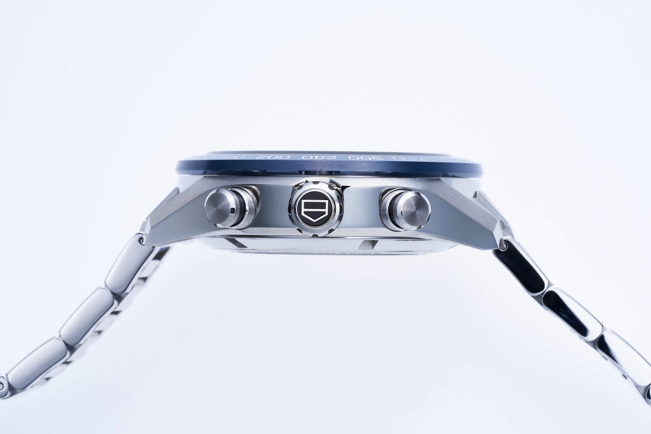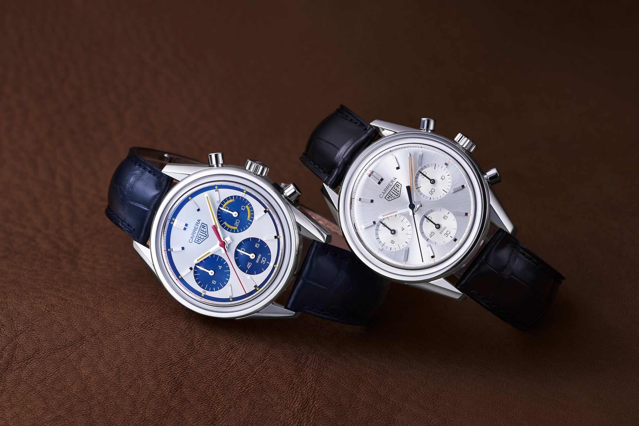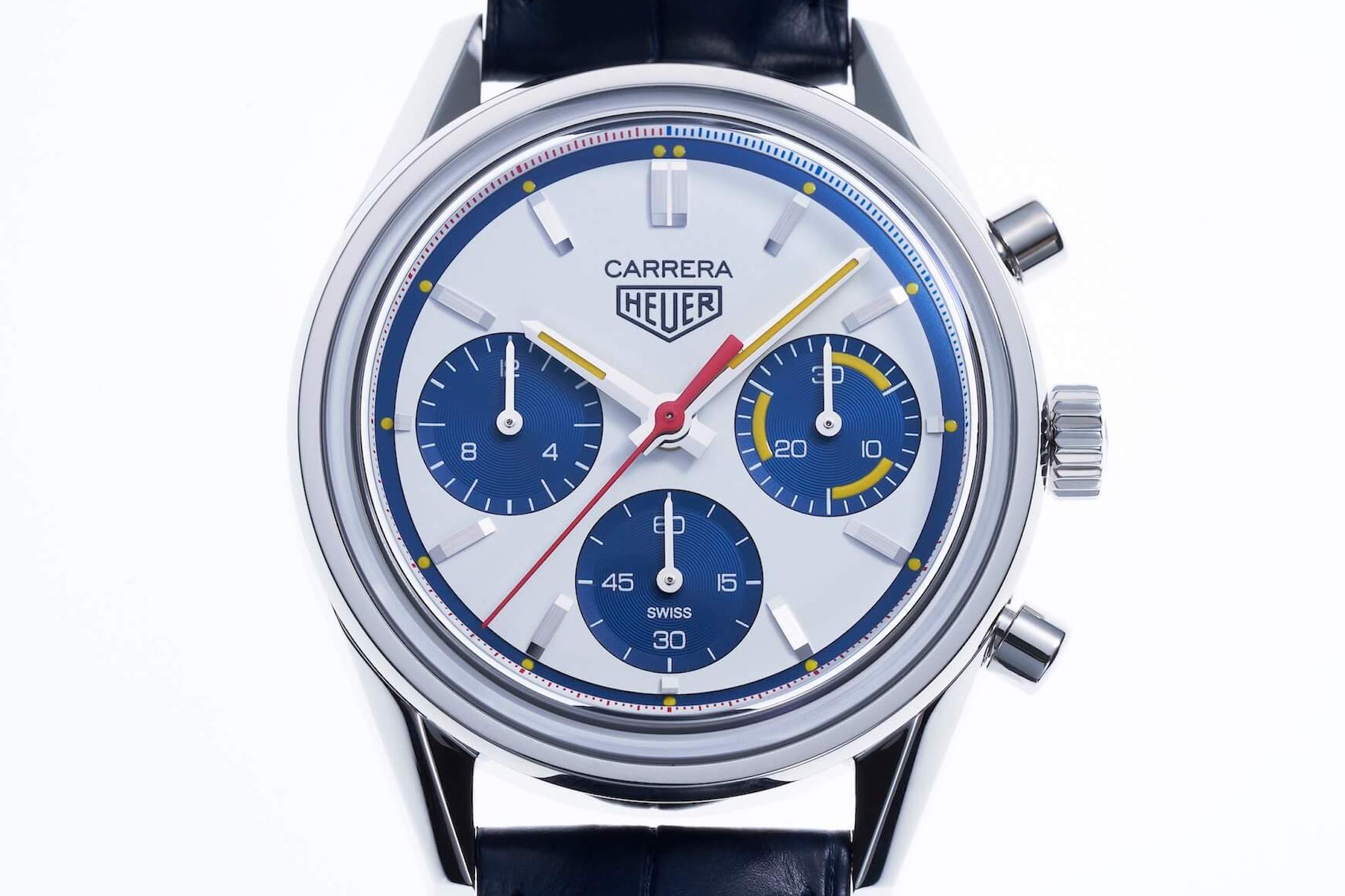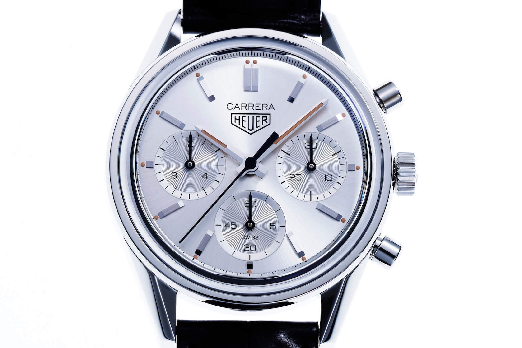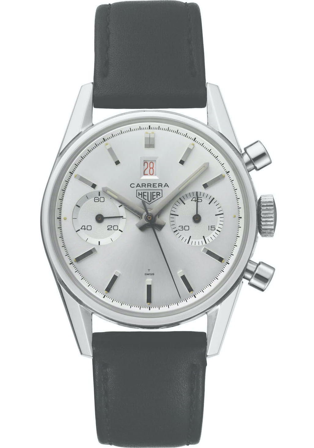 まず、カレラを定義付けているデザインとは視認性の高いダイヤルとポリッシュされたファセットラグだ。それ以前の複雑な構成が主流だったクロノグラフの文字盤を、よりすっきりと必要な要素にフォーカスしてミニマライズし、エルヴィン・ピケレ社が開発したエレガントながら特徴的なラグをもつこのケースによって、全体に立体感を付加した。これらのアイデンティティは現在のタグ・ホイヤー カレラにも受け継がれており、今年アップデートを加えながら復刻された、160周年記念モデル(上写真)はカレラの魅力を凝縮したような1本である。