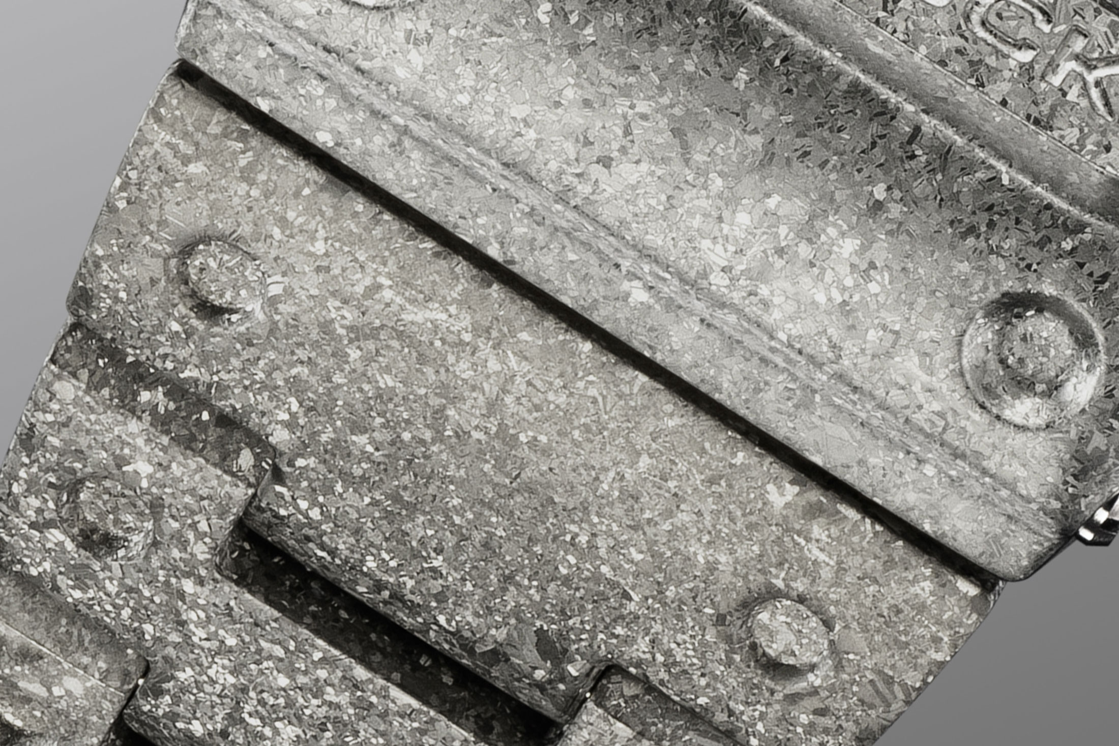 リクリスタライズドシリーズでは、ベースとなるSS材に複数の加工を施している。まずは、数百度もの高温で熱処理を加えることによる再結晶化処理。これにより、滑らかだった素材の表面に不規則に破片を散りばめたような結晶模様が浮かび上がる。さらに、そこへ炭素ガスを浸透させる深層硬化処理を行うことで、素材の外側に硬化層を創出。この技術は通常、産業用マシンや車のギア、およびシャフトなど強度を求められる内部パーツに用いられるものだ。そして、最後にシルバーパーツにはTIC、ゴールドパーツにはIPの表面処理をオン。最終的に今作では、元のSS素材の3倍ほどになる表面硬度を実現したという。見た目上の質感はざらついているが、実際にはスムースで滑らかな質感が楽しめる。