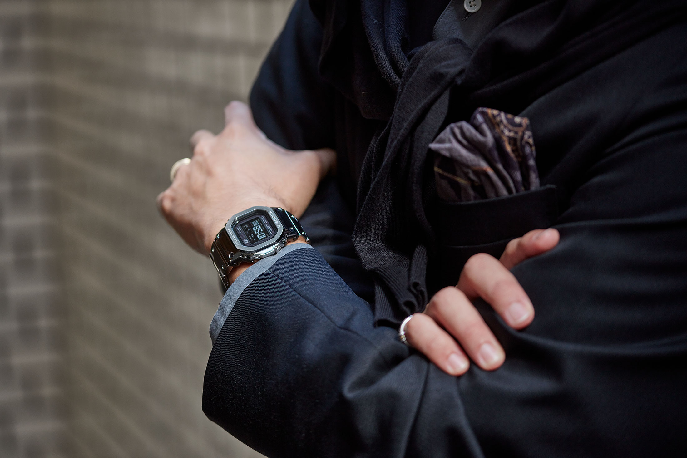 AIを活用したレギュラーモデルの1作目となったMTG-B4000は、“構造の進化”をコンセプトに、メタルと樹脂といった異素材の融合によって次なる耐衝撃構造を生み出すという、シリーズにおける必然的な課題に真正面から取り組んだモデルである。そこにAIデザインによる構造解析や荷重シミュレーションを組み込むことで、従来の延長線上にはないフレーム構造を導き出した点に、このモデルならではのAI活用の意義があったのだ。これに対してGMW-BZ5000は、そうした構造面での知見とフルドット表示という表示技術を、5000のスクエアケースという原点のフォーマットに統合してみせたモデルである。スポーツモデルではないレギュラーラインの5000として、プロポーションやフェイスデザインといった“5000らしさ”を崩すことなく、ケース構造の刷新と新しい表示デバイスの搭載を両立させること。そのうえで、ソーラー駆動によって日常使いに十分な実用性を確保すること。クラシックな外観を継承しながら、保守と革新という相反する要請を一体のプロダクトとして結実させた“攻めの5000”の姿勢が、GMW-BZ5000に託された役割であった。