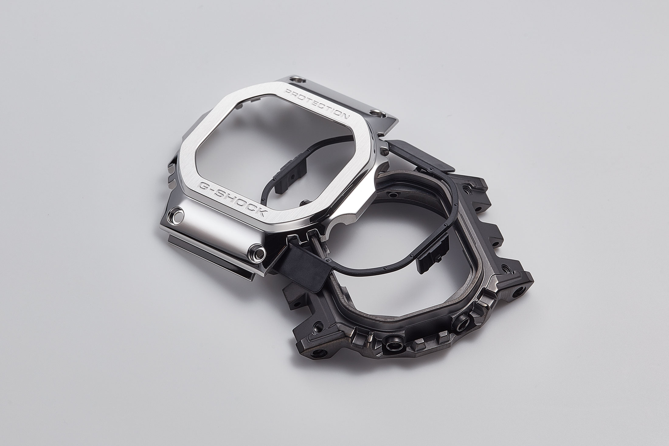 5000のデザインにメスを入れた耐衝撃構造はしかし、従来以上に鍛造による製造工程を複雑にした。これまで覆われていたベゼルパーツとセンターケースの噛み合わせ部分が、表出することになったからだ。G-SHOCKに求められる高い加工・組立精度を満たしながらこの変更を製品に落とし込むまでに、どれほどの苦労があったのか。小島氏曰く、工法や工程の面でも改善を重ねる必要があったという。