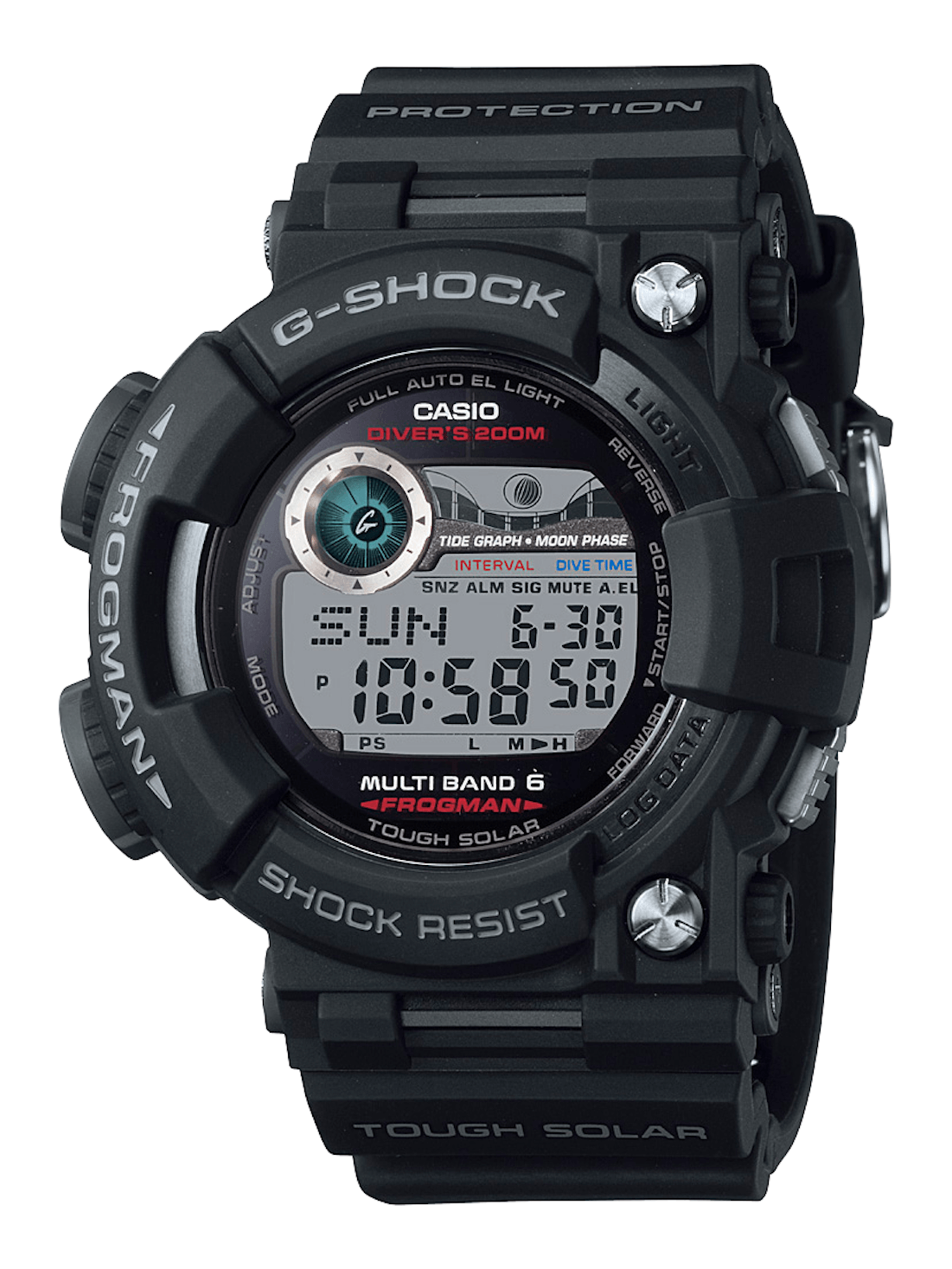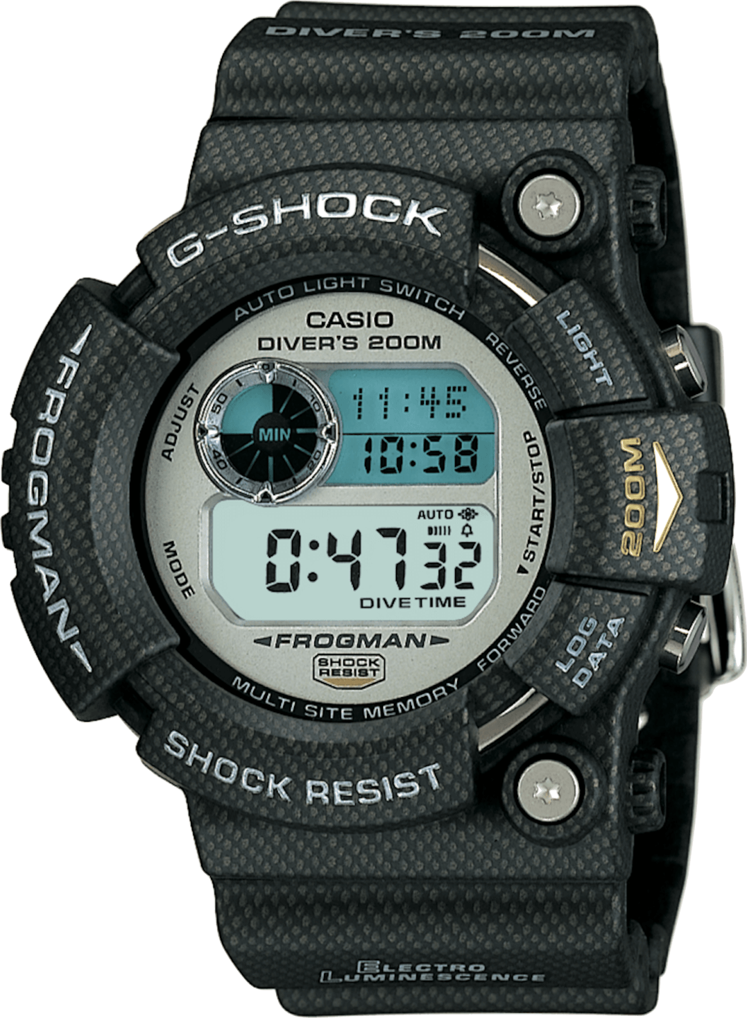 フロッグマンとはその名の通り潜水士の使用を想定して作られた時計であり、屈強なG-SHOCKの中でもとりわけタフなISO(国際標準化機構)準拠の200m防水性能を備えた特別なモデルである。間違いなくG-SHOCKのカルト的人気を支える柱となった1本で、初出は1993年。初めてニックネームが付いたG-SHOCKでもあり、その人気に支えられ歴代モデルで数々の先進技術や最新の構造が搭載されてきた。