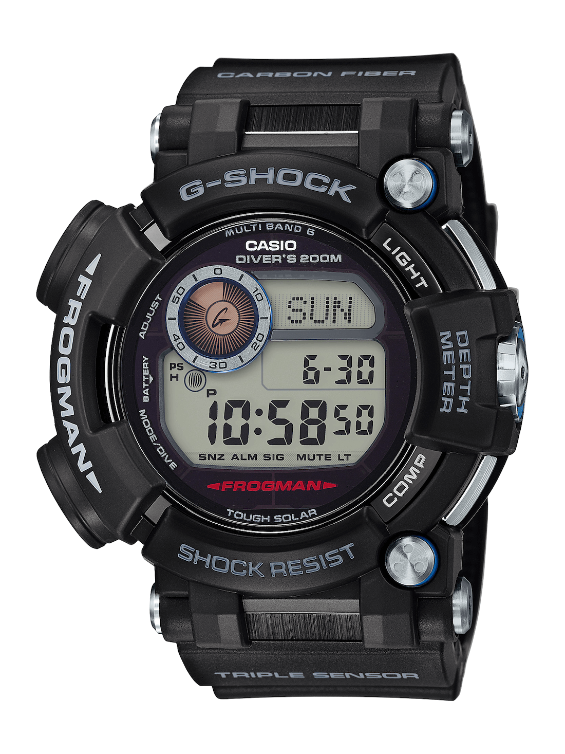 フロッグマンとは、G-SHOCKで唯一ダイバーズウォッチをかたっている時計だ。G-SHOCKは全てのモデルで20気圧防水を実現しているが、ISO準拠のダイバーズ規格をクリアしているのはフロッグマンだけである。さらに、フロッグマンは前作のGWF-D1000で水深計(トリプルセンサー)までも搭載し、10cm単位での水深計測を可能とした。これは、そもそもこのシリーズがデジタル表示を前提としていたからフィットした機能だと思うし、事実、水難救助隊の意見も取り入れられた前作はダイブコンピュータを圧倒する性能を誇っていた。カシオが、性能という側面でフロッグマンを磨き上げた、ひとつの頂ともいえるだろう。