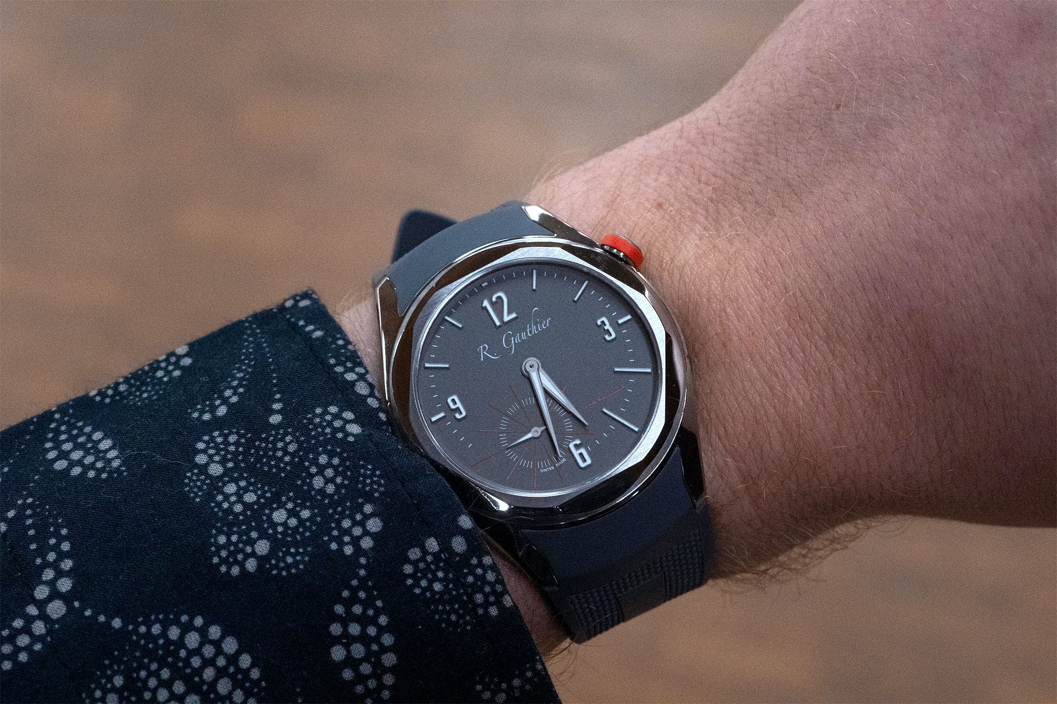 私はローマン・ゴティエ(Romain Gauthier)のファンなので、オンリーウォッチの後にゴティエ氏と話をしたり、彼の最新作である総チタン製のコンティニュアムを見る機会を期待していた。幸いにも実現し、ゴティエ氏とオークションのことや、たまたま身につけていた彼の新しい時計について15分ほど話した。この時計は、わずか55グラム(オメガのアクアテラ ウルトラライトと同じ)、価格は3万7000スイスフラン/約425万円(オメガよりも安い)ながら、ローマン・ゴティエが誇るディテールへのこだわりと驚くべき精巧さを備えている。