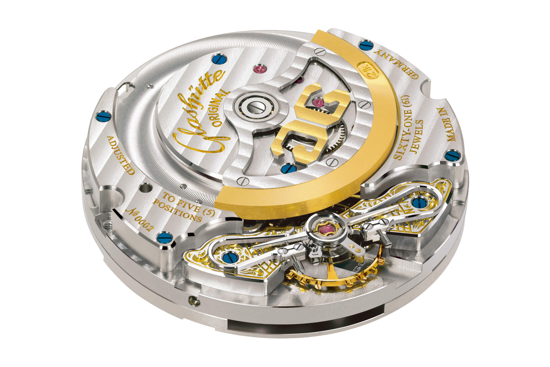 なお、サファイアクリスタルのケースバックから覗くムーブメントは既存モデルと同様で、自社製のCal.90-02。グラスヒュッテ・オリジナルの特徴ともなっているダブルスワンネック緩急微調整をはじめ、4分の3プレート、ブルースクリュー、ネジ留めゴールドシャトン、グラスヒュッテストライプ装飾など、丁寧な仕上げを施す。