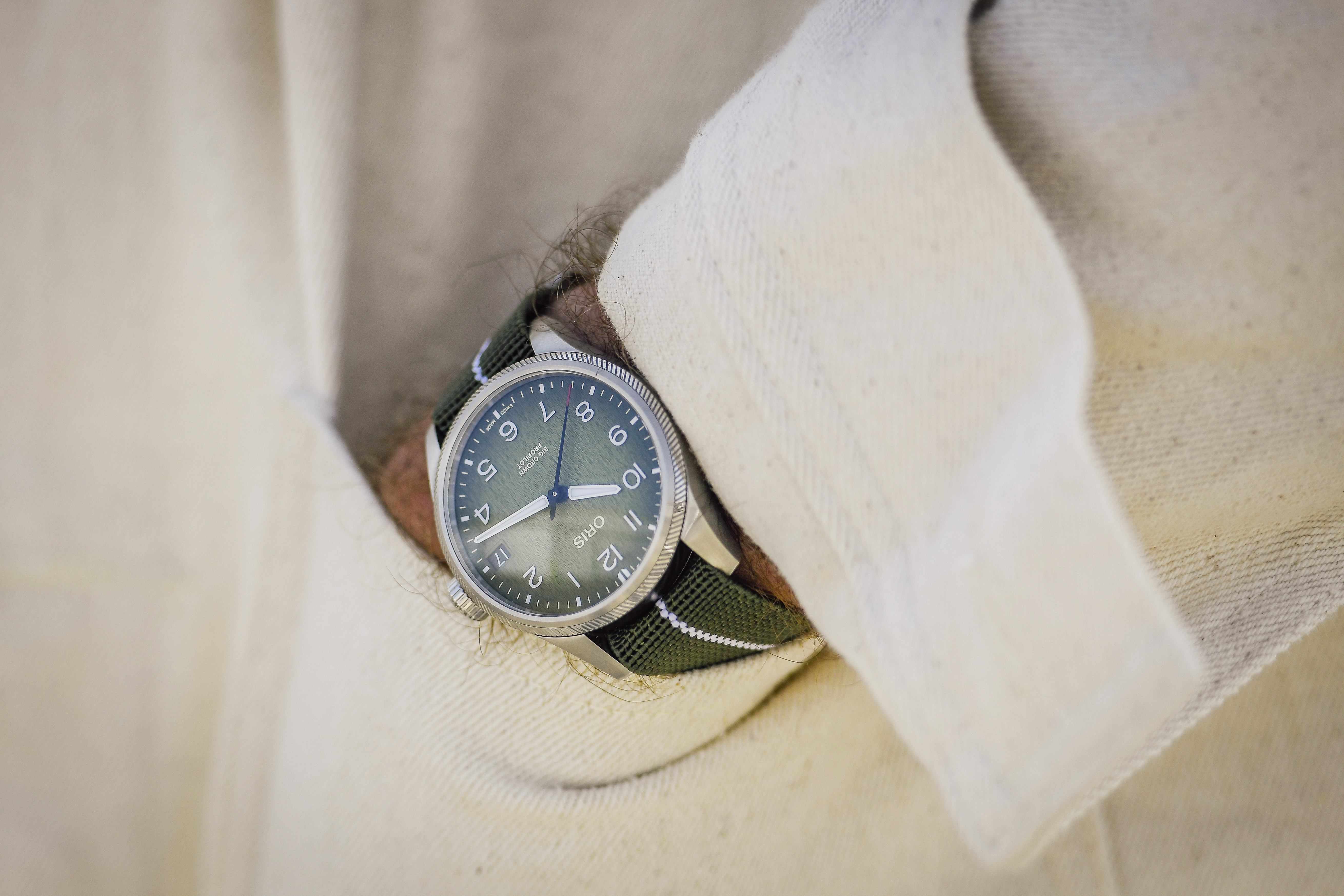 時計には、 エリカ社製オリジナルのカスタムストラップとNATOレザーの2種類のストラップが付属している。エリカ社製のストラップは最高のつけ心地で、まさにO.A.R.のパイロットとしての任務のときに身につけたくなるようなものである。頑丈で、ほとんどの人にフィットし(伸縮性に富んでいる)、クラスプのメカニズムもしっかりしている。ビッグクラウン プロパイロットは回しやすい切削加工のリューズやこのシリーズならではのベゼルにフライス加工された美しいフルーテッドパターンを備えた分厚いケースなど、その用途に適した機能的なデザインが満載である。オリス独自のフルーテッドベゼルはプロパイロットXで採用したようにチタン製でもすばらしいが、41mmのステンレススティール製ケースでも同様にしっくりくる。立体感あふれる大きなアラビア数字がダイヤルに浮かび上がり、ビッグクラウン プロパイロットラインの最大の強みである視認性が際立っている。質感あふれる明るいダイヤルで、数字のシンプルさがうまくバランスをとっている。針はホワイトで夜光塗料が塗られ、明るいグリーンのダイヤルに適度なコントラストを与えている。