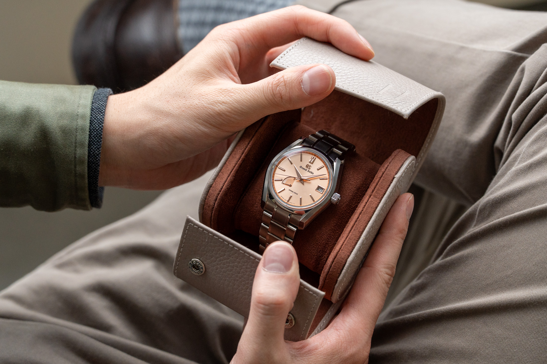 ケースバックは、既存の62GS現代デザインモデル同様、本作もシースルーバック仕様となっており、サファイアガラスの中央にはグランドセイコーの象徴である獅子のロゴがあしらわれています。ただし本作では、そのロゴがダイヤルと呼応するピンクゴールドカラーでプリントされています。