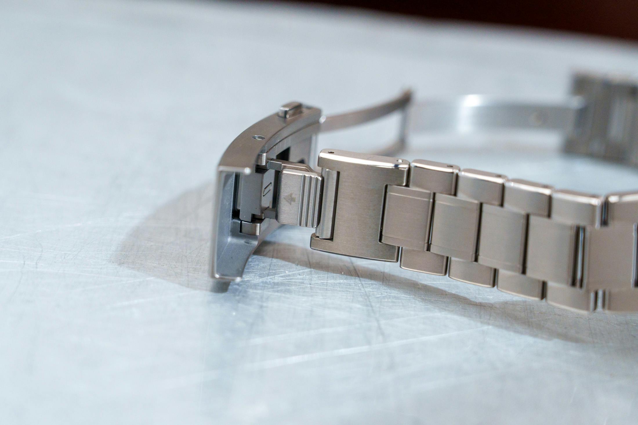 ストラップ/ブレスレット: ブライトチタン製ブレスレット、開閉ロック機構と微調整機構、エクステンション機構付き
