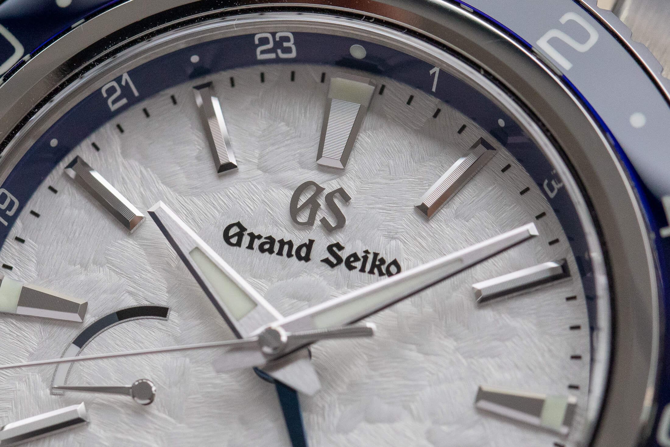回転ベゼルの2色の塗り分けは、昼夜をひと目で判別できるようにするためのもの。一般的なGMTベゼルは通常6時と18時の数字を二分するように色分けがなされていますが、グランドセイコーの場合は、ベゼル上の数字の判読性を損なわないようにするために数字を避けた作りになっています。ベゼルだけでなくフランジ上の固定式24時間スケールも同様に塗り分けられていることでデザインの統一感が感じられます。