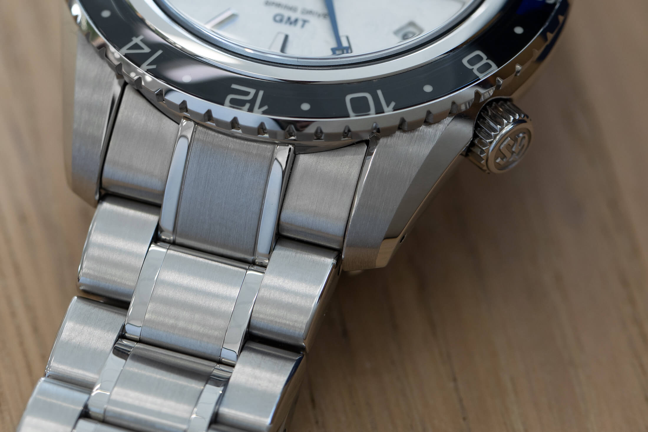 SBGE265のブレスレットは、サテン仕上げと鏡面仕上げが組み合わさることで、立体的な印象を与えます。もっとスポーティに着けたい場合は、交換用として付属するシリコン製のブルーストラップに付け替えるのも良いでしょう。スポーツウォッチ、特にフラッシュフィットの形状によっては、ブレスレット交換を行おうと思ったときにラグの内側を傷つけてしまわないかという不安はつきものです。幸いこのSBGE265は他の多くのグランドセイコーと同様に貫通式ラグが採用されているため、付替えはとても簡単で安全。そのため気分次第で変えるのも楽しみの一つになると思います。