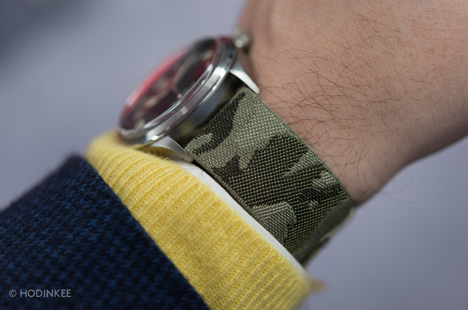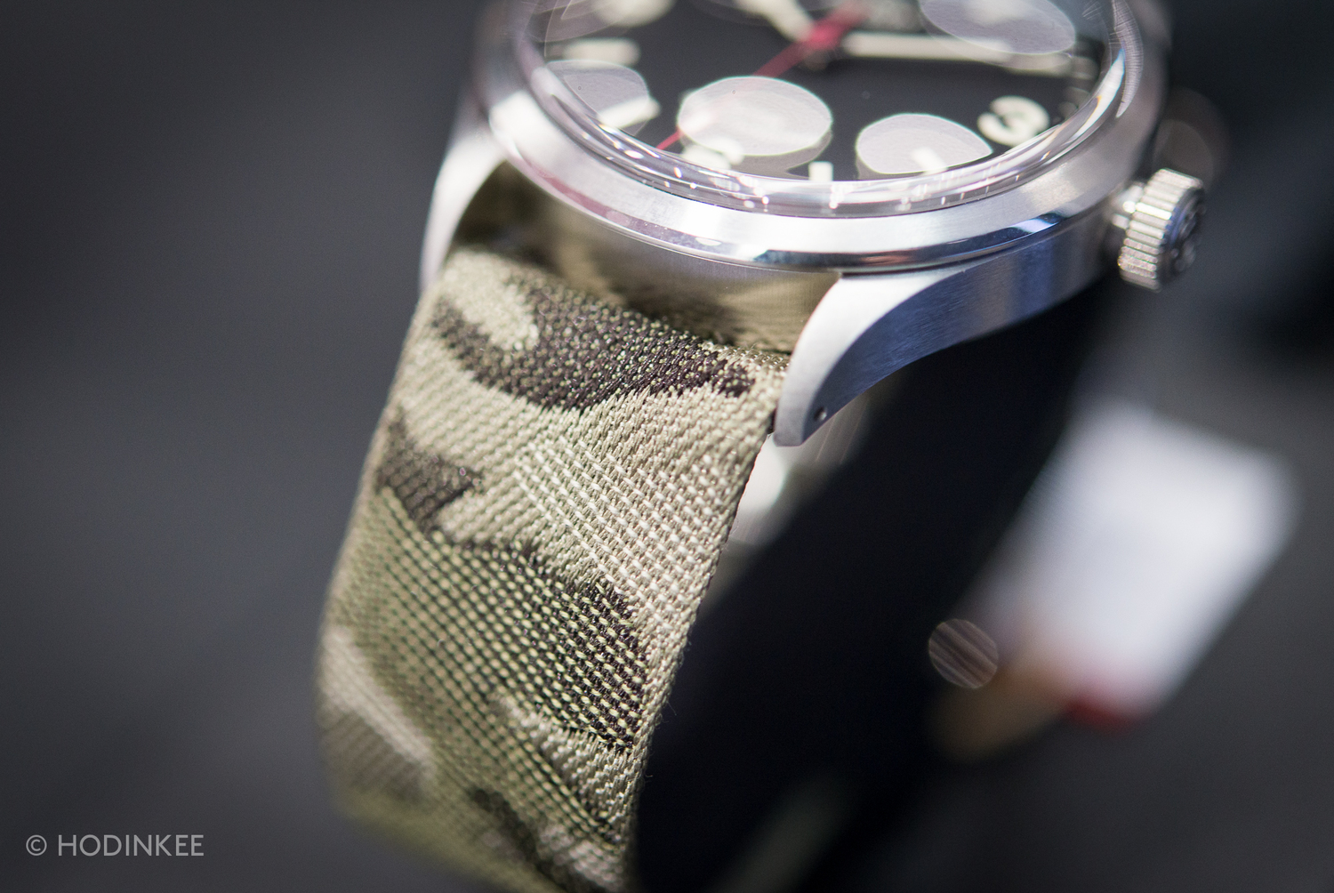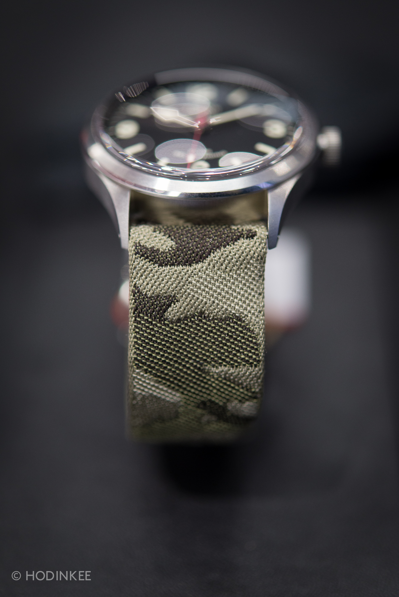 最後に、どのオプション(SSブレスレットかブンドストラップ、または通常のカーフレザー)を選ぶにしても、レンジャーにはファブリック製カモフラストラップが付属する。そう、確かに私はカモフラと言った、そのままカモフラージュ模様のことだ。冗談だと思われそうだが、これは冗談ではない。そしてもちろん、15ドルのナイロン製NATOストラップとは訳が違う。