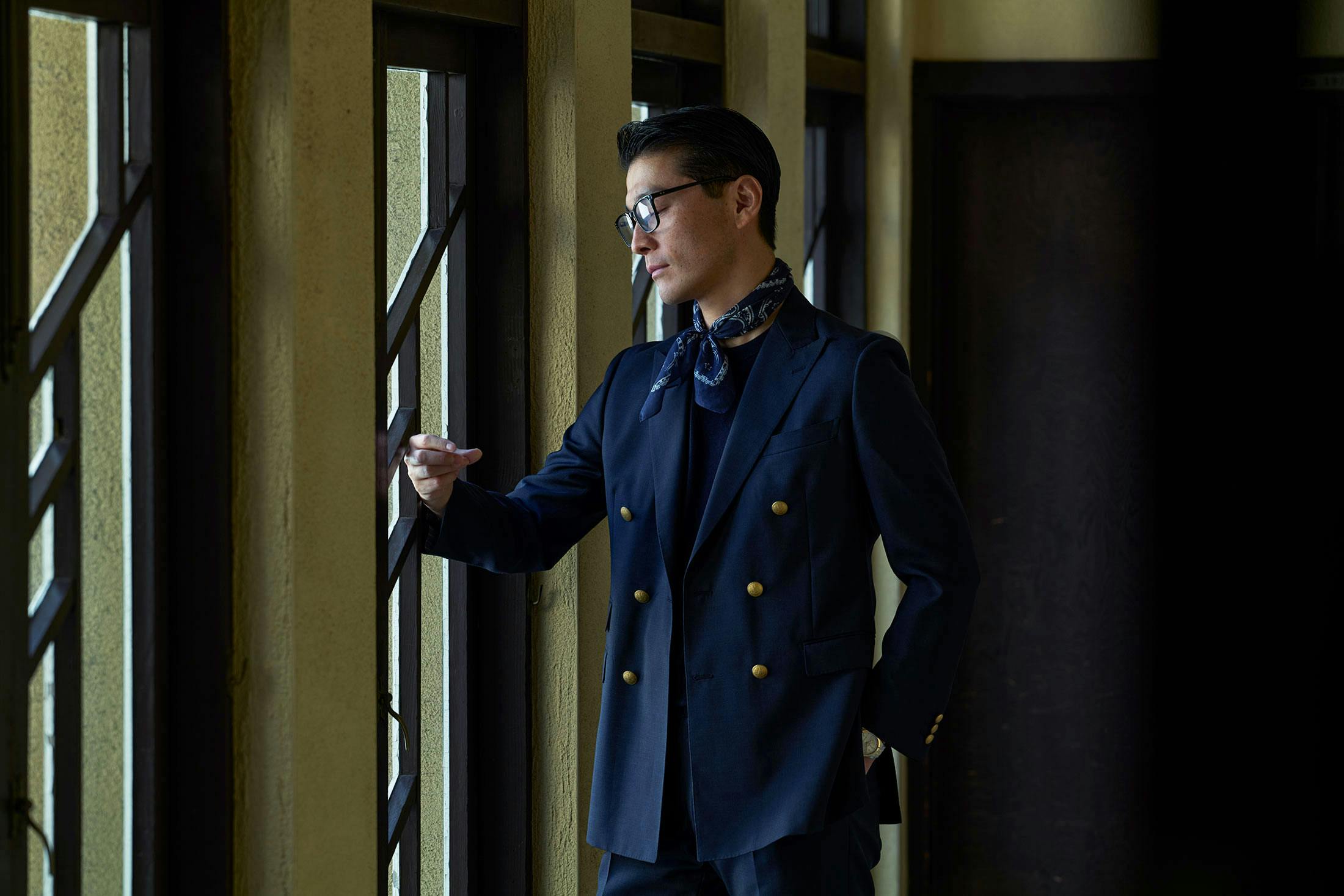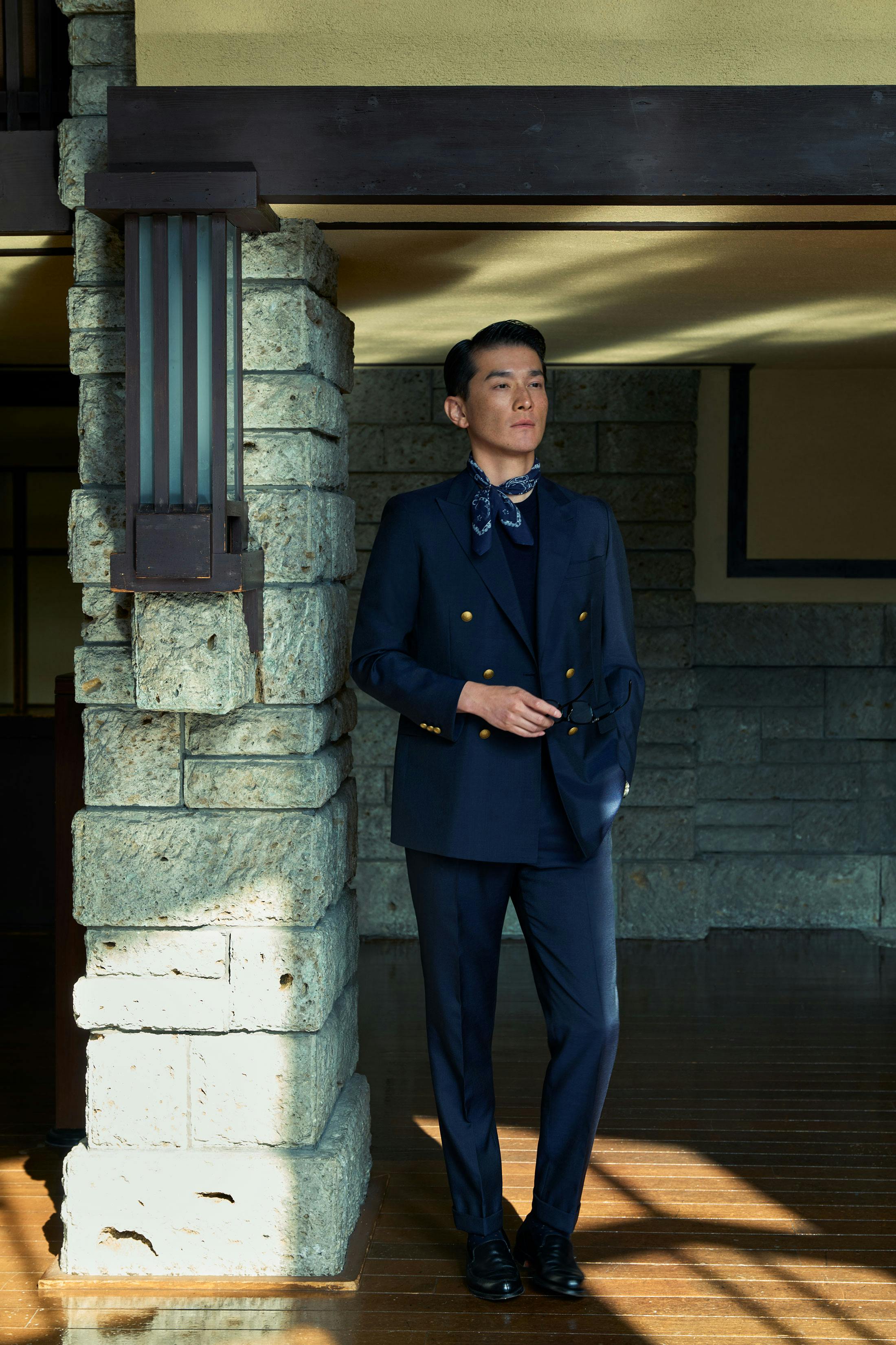 なおこちらの一着は単品のジャケットではなく、珍しい“ブレザースーツ”である点にも言及しておきたい。共地のスラックスを仕立てればより華やかな印象になるだけでなく、シーンに合わせた着回しまで楽しめる。既製品ではなかなかお目にかかれないアイテムだからこそ、オーダーメイドであることのアドバンテージが薫る。なお、ブレザーはスポーツやミリタリーに由来する服のため、ノータイでさらりと着こなすのにもぴったりだ。スーツでもこのように軽やかな装いには、ブラックベイのカジュアルな顔立ちがよく似合っている。
