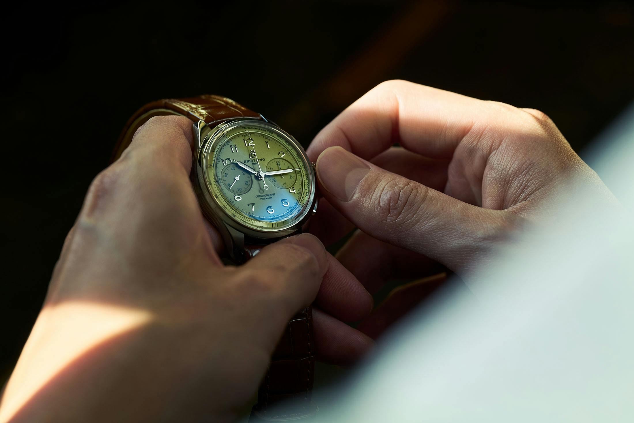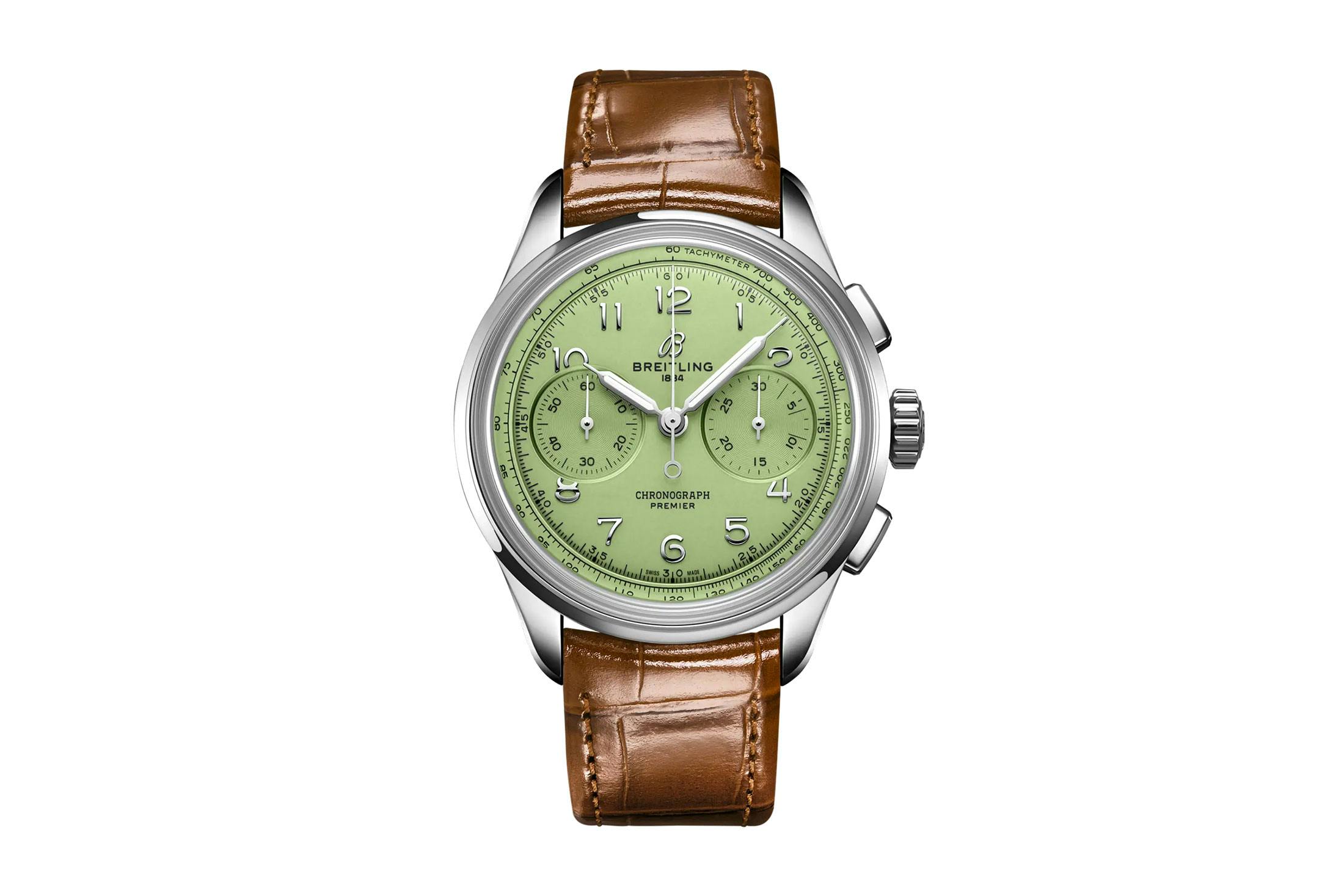 そんなスーツスタイルに合わせる時計は、やはりさりげない粋を薫らせる一本がいい。たとえばブライトリングのプレミエ B09 クロノグラフ 40などは絶好の選択だ。プレミエ自体は1943年に誕生し、クロノグラフを計器から“スタイル”に昇華させた、同ブランドにおけるドレスウォッチの金字塔である。長方形のプッシャー、ヴィンテージテイストが薫るインデックスや針など、意匠はあくまで伝統的。そこに新鮮なツイストを加えているのが、ピスタチオグリーンの文字盤だ。このような淡いカラーダイヤルは時計業界の次の潮流と目されており、旬度は非常に高い。しかし、そんな背景を知らずとも垢抜けた印象は十分伝わってくる。