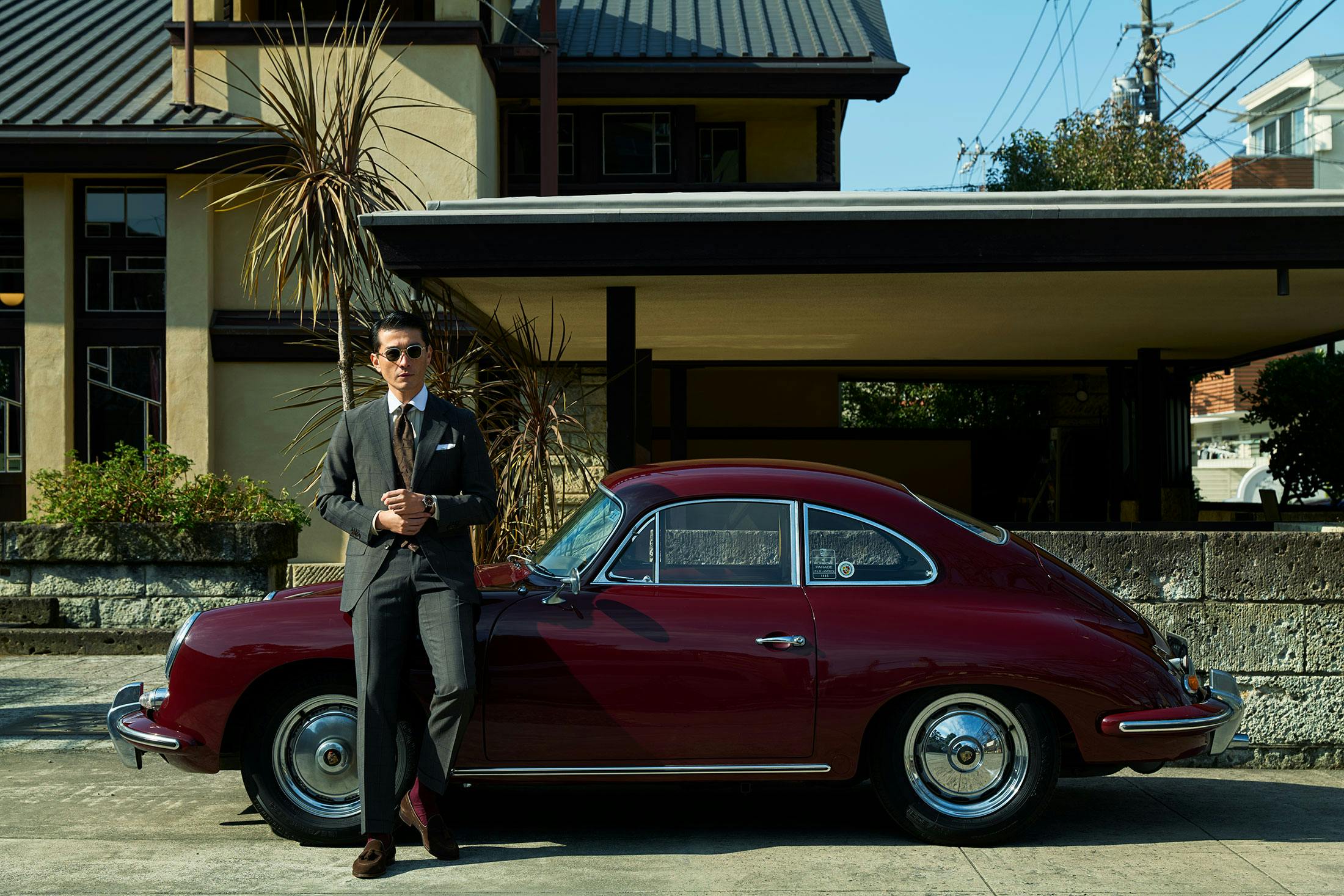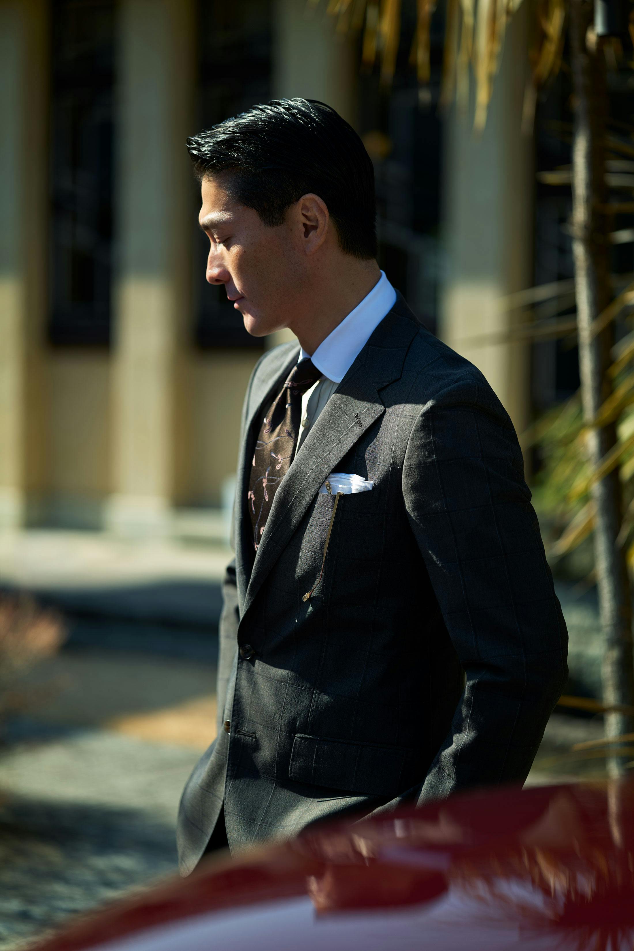 陽光を麗らかに反射するキッドモヘアスーツにほのかな遊び心を添える、ピスタチオグリーンの手元。これ見よがしな派手さとは無縁でありながら、洗練にあふれた佇まいだ。ちなみにこちらのスーパーブリオも麻布テーラーによる今季の別注となっている。モヘア54%にウール46%と天然素材オンリーだが、ナチュラルストレッチ加工を施してストレッチ性も実現した。見た目だけでなく、現代のドレススタイルに求められる着心地にも配慮した、限定ファブリックなのだ。