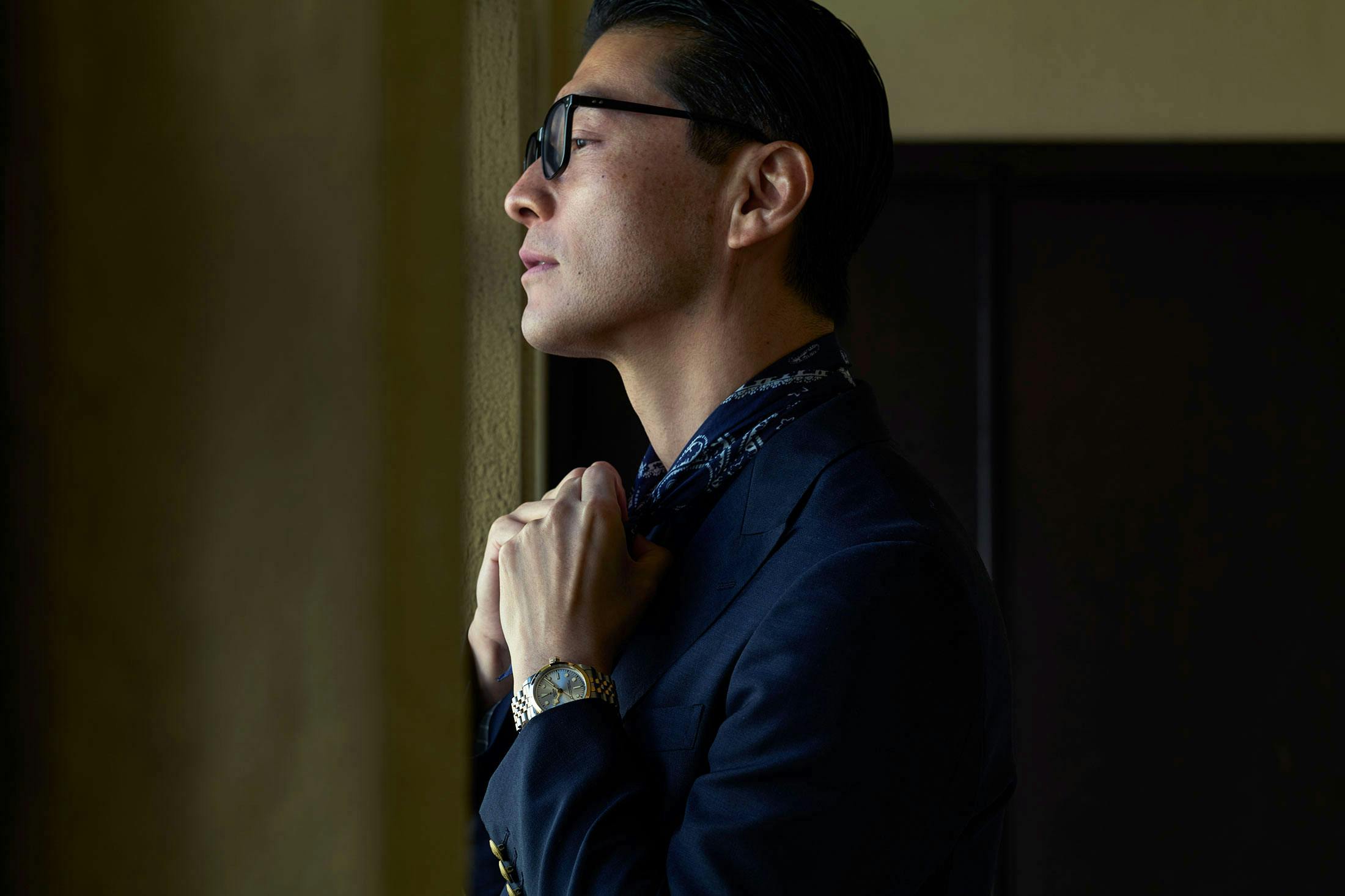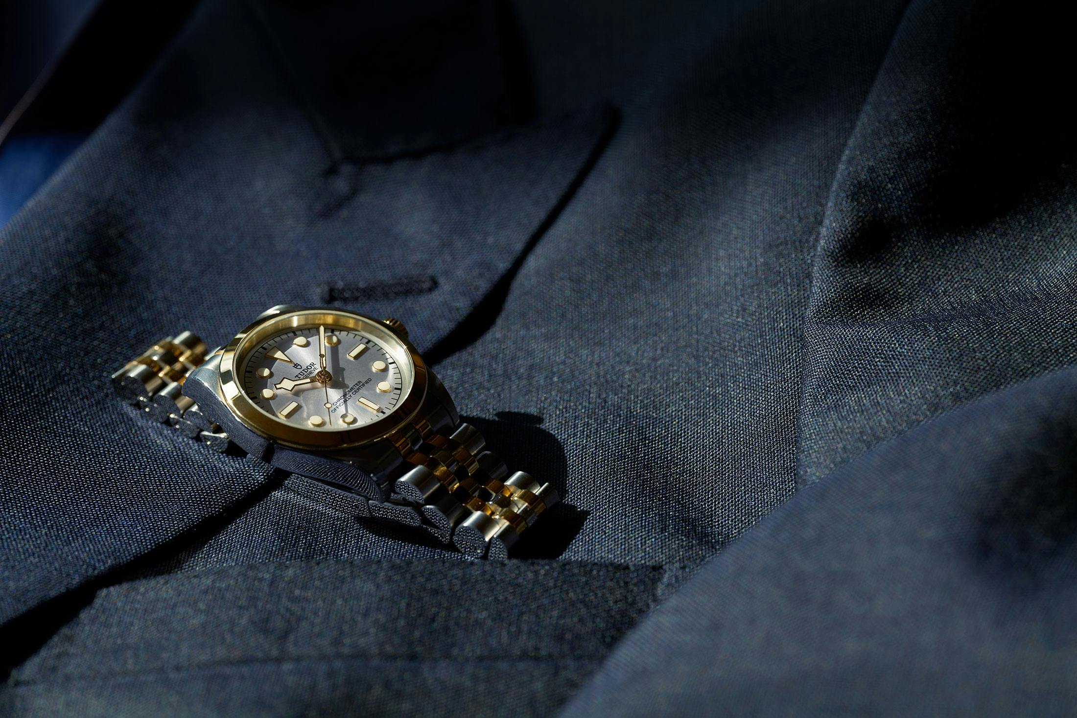 そんなスーツの手元に彩りを添えるのが、チューダーのブラックベイ ワン 36 S&Gである。ツールウォッチの系譜を受け継ぐシルエットと、同ブランドのダイバーズにおけるアイコンであるスノーフレーク針は、チューダーの血統を感じさせるデザインだ。しかし、ベゼルやブレスレットのセンターリンクにイエローゴールドキャップを施すことで、海よりも都市での使用を前提としたエレガンスを取り入れている。フルゴールドよりも涼やかな印象にして、ステンレススティール(SS)製の時計よりも華やか。まさに、本モヘアスーツと同じキャラクターを持つ時計と言える。36mmというケース径はジャケットの袖口にうってつけだ。