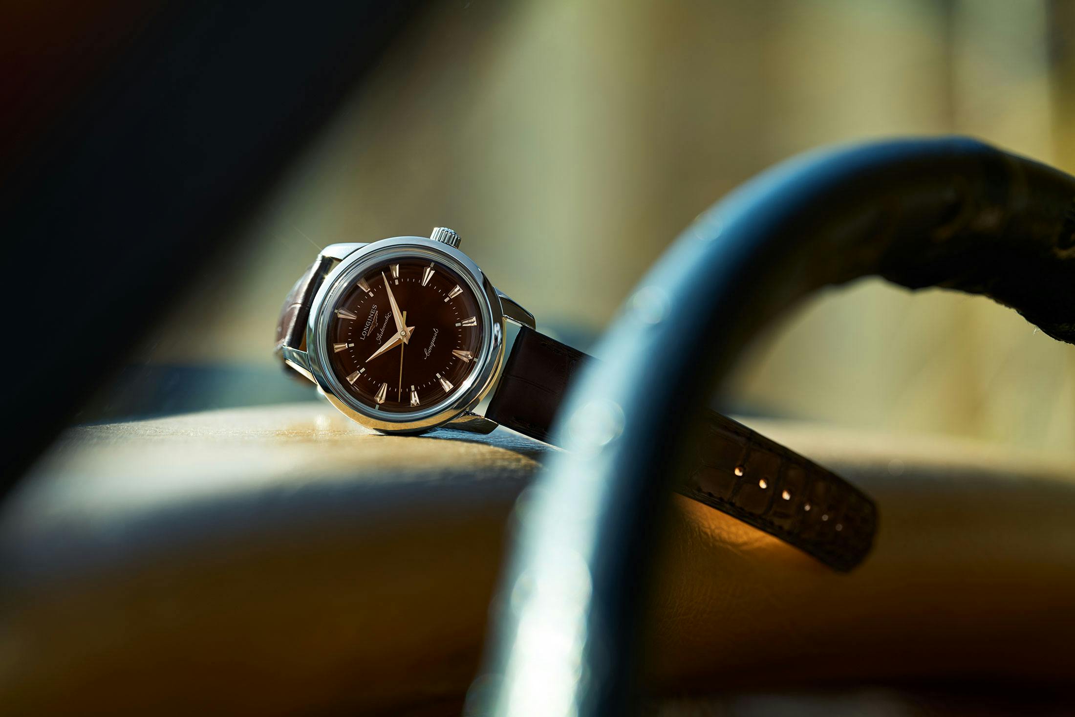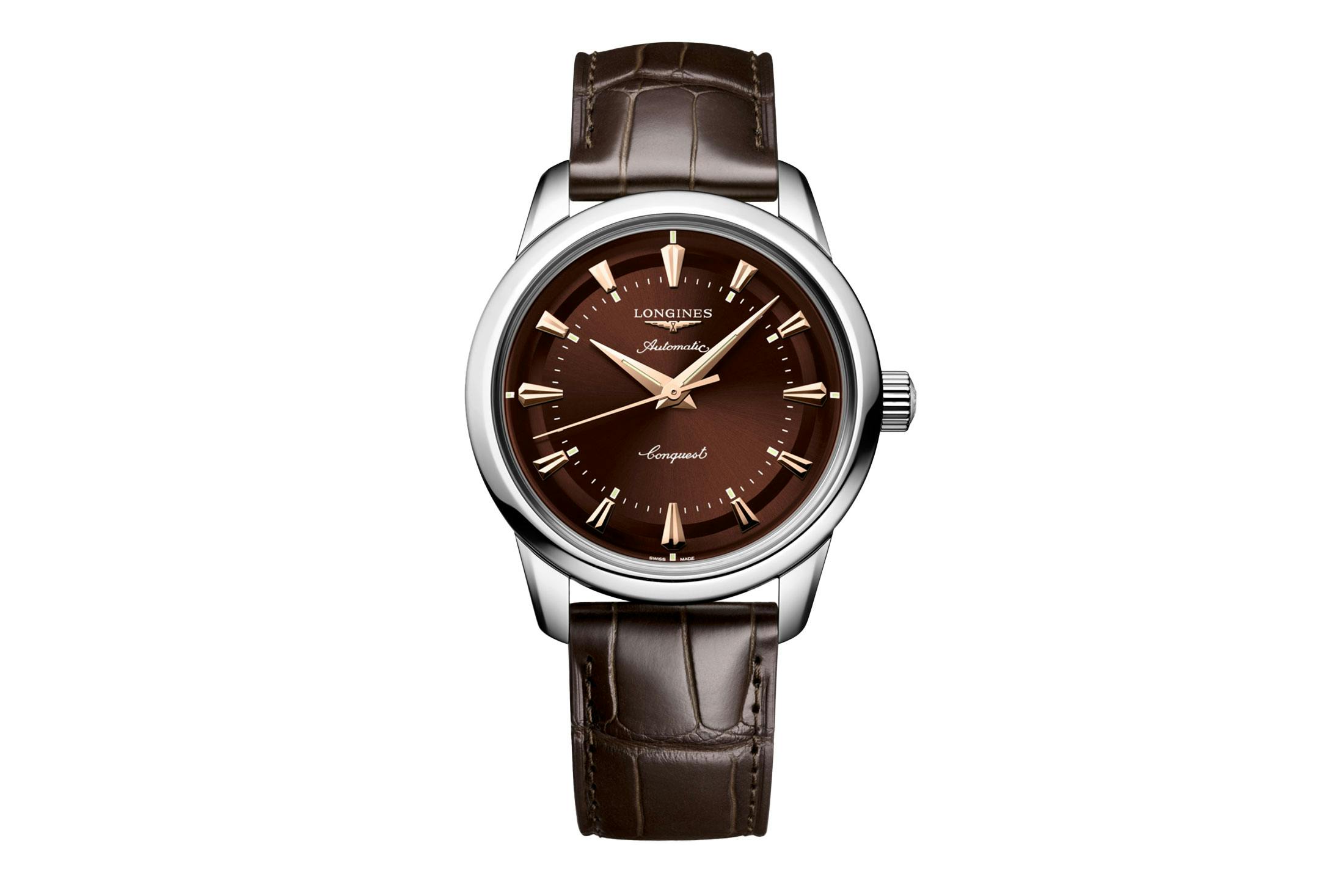 38mm、40mm(SSブレスのみ)のサイズ違いで展開するコンクエスト ヘリテージ。SSケースにブラウン文字盤、ゴールドカラーのインデックス&針という組み合わせが実に渋く、クラシックを匂わせる顔つきだ。裏蓋には魚のモチーフをあしらった18Kゴールド製のメダリオンが配され、1950年代から変わらないエレガンスを示している。※麻布テーラーでの取り扱いはなし