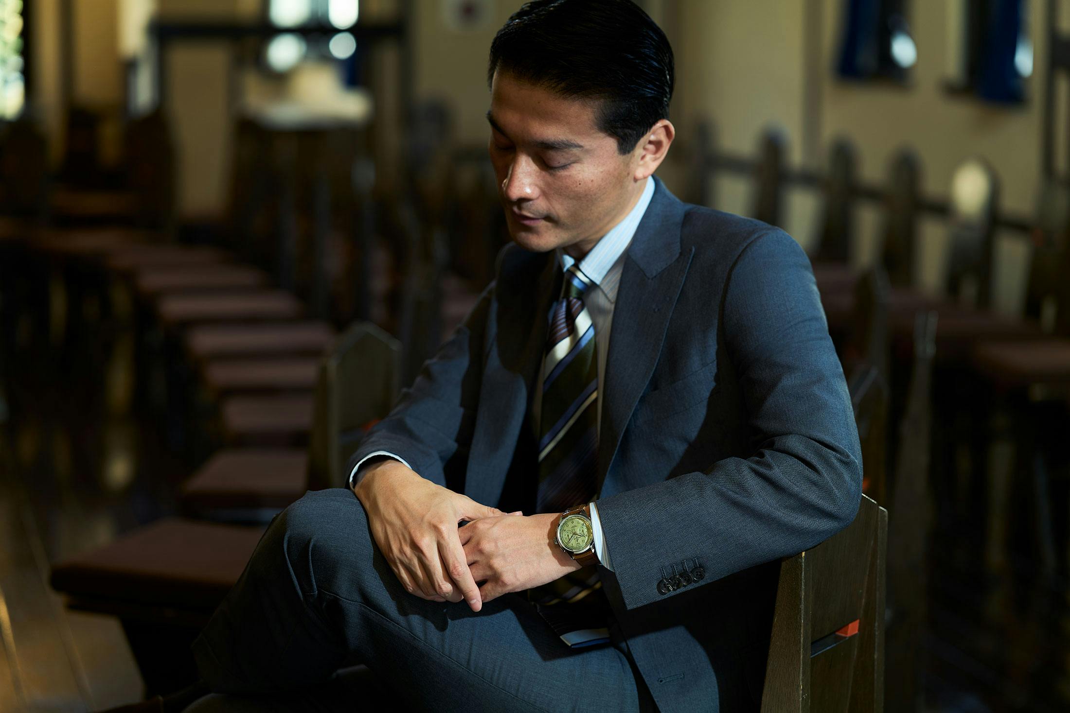 日本を代表するオーダースーツ店のひとつ、麻布テーラーが今季提案するモヘアスーツは、そんな願いを解決に導く一手となる。スーツ好きにとっては馴染み深いクラシックな素材だが、同社では今季、イタリアとフランスの名門メーカーに別注をかけた特別なモヘアファブリックを製作した。華やかな光沢、美しい仕立て映え、そしてシャリッとした清涼感といったモヘアの特性を継承しつつ、より軽やかに、柔らかにアップデートされているのが特徴だ。ちなみに同社のスーツは、個々人のオーダーに応じてすべて自社ファクトリーで作られている。時計に置き換えるならばマニュファクチュールと言えるだろうか。テーラリングの伝統を礎としつつ、時代をキャッチアップする進化も忘れない。そんな哲学は、まさに名門機械式時計ブランドに近しい。両者を巧みに掛け合わせれば、装いの魅力はいっそう輝くはずだ。今回は腕時計も、伝統を背景とした時代へのマッチアップをテーマとした。その実例をお目にかけたい。
