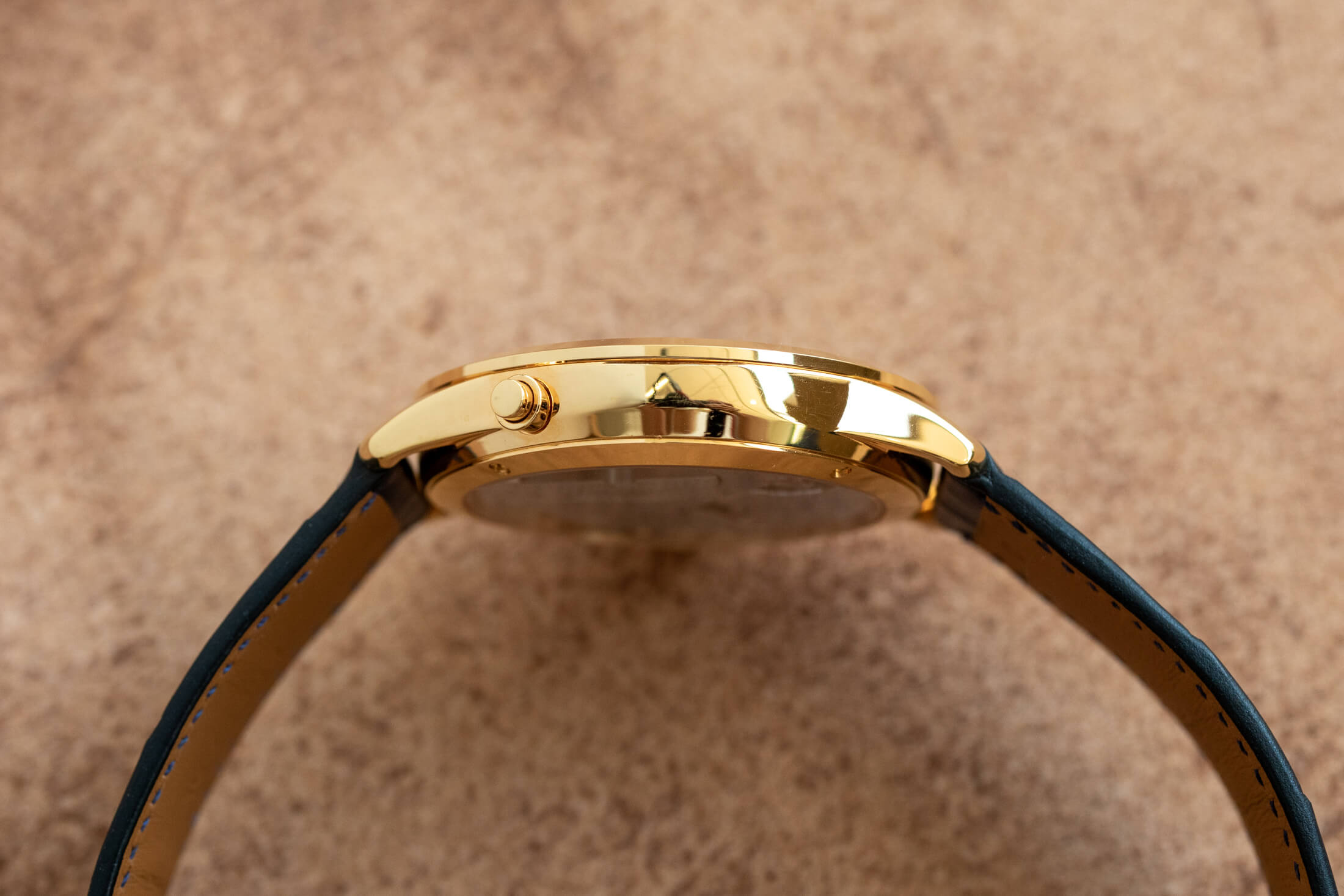 さて、この時計は"スリム"を標榜するだけあって、複雑機構を搭載しながら非常に薄型でありケースサイドから見るとケースの曲線美に息を呑んでしまう。スマートな長いラグからは、当然、エルメス製のアリゲーターストラップが伸びる。ブルー・アビスという名の色をもつこのレザーは、マットな質感で、ポリッシュされて輝く18KPGケースとのコントラストがとても美しい。