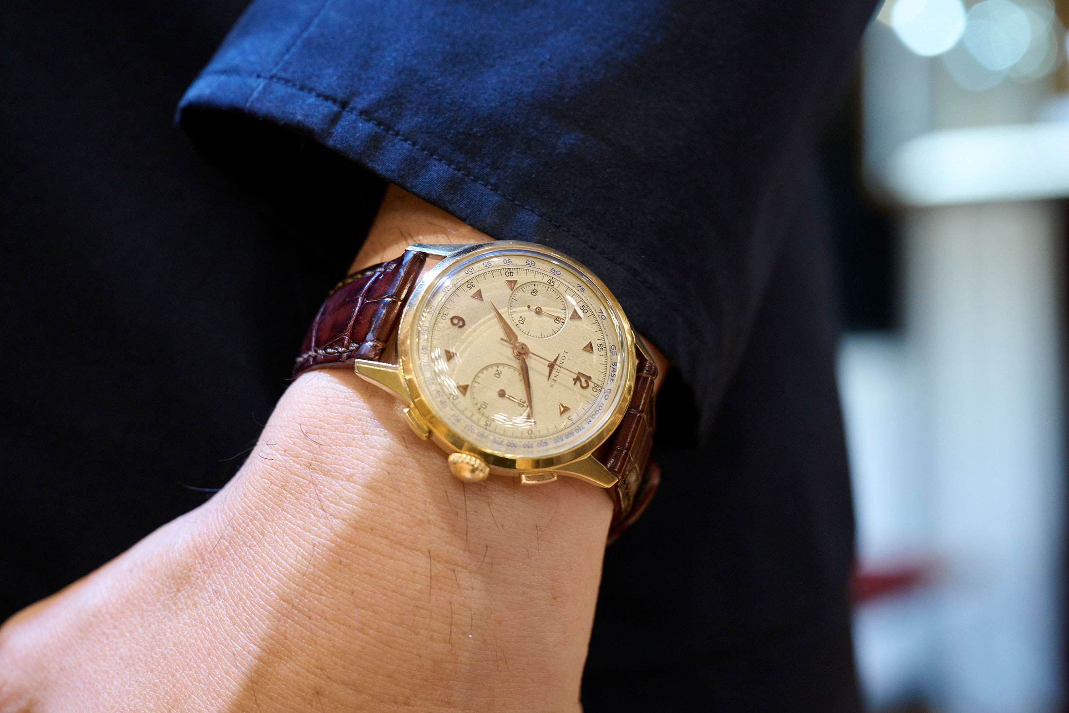 1937年に登場した、世界初の防水機能付きプッシャーを備えたクロノグラフ。その独特な形状から、マッシュルームプッシャーの愛称でも知られる。