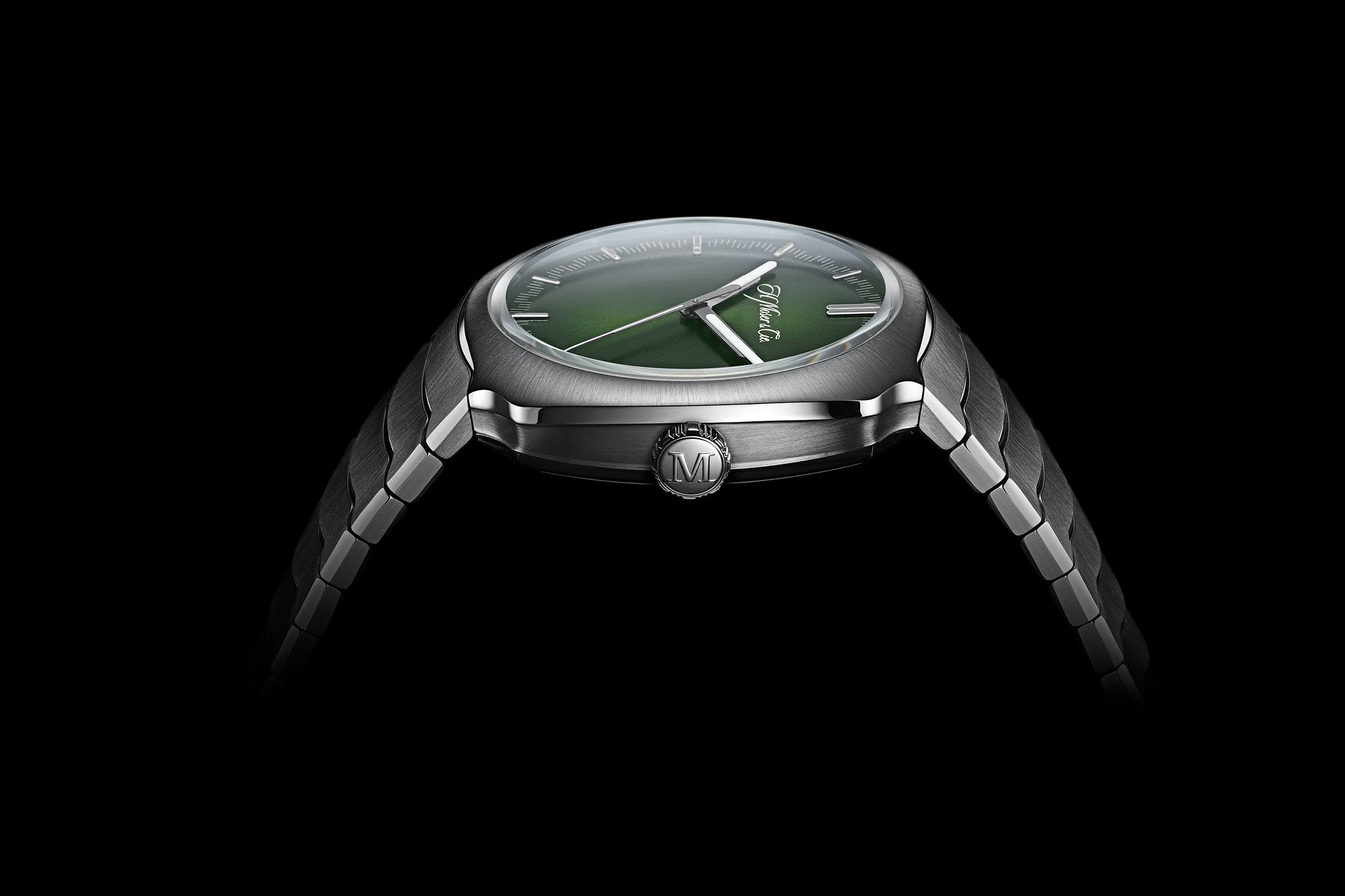 ストラップ/ブレスレット: ケース一体型SS製ブレスレット。H.モーザーのロゴが施された3枚のSS製ブレード付きフォールディング・クラスプ