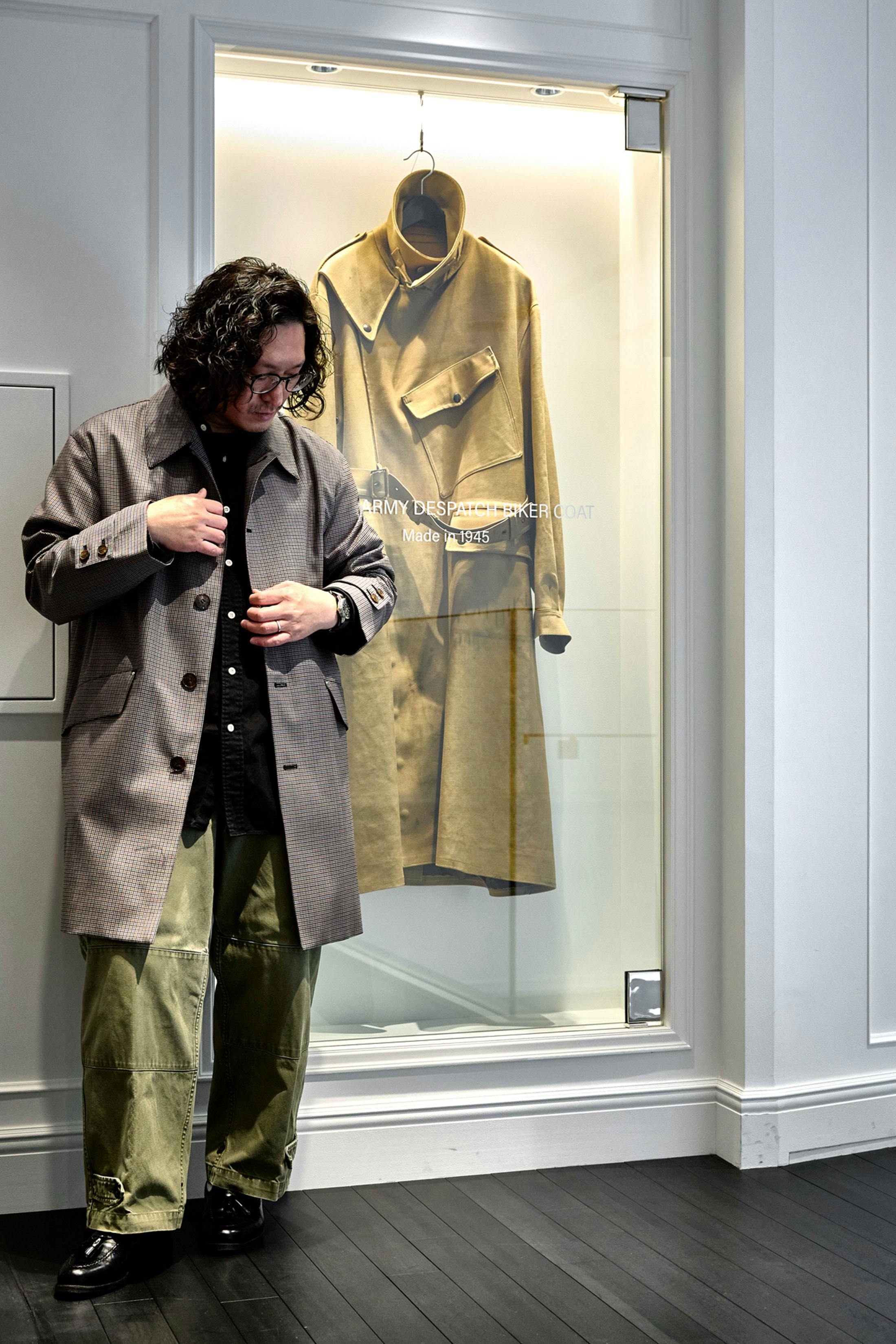 正直なところ、当初は他の部員が手にするコートに比べ、色もディテールも控えめなこの一着に、一抹のもの足りなさを感じたのも事実だ。だが、いざ袖を通してみると、その思いは一変した。細部に至るまで、実に理にかなったギミックが凝縮されていたからだ。そもそもこのモデルは、乗馬用コート、すなわちライディングコートをルーツに持つ。それを象徴するのが、シルエットを絞るためのウエストベルトと、レッグストラップの意匠である。これらは本来、馬上で風にあおられ、裾がはためくのを防ぐために考案された実用的なディテールだ。1920〜30年代に見られた、スポーツや乗馬に由来するコートにも通じる設計であり、後年はバイカー用のモーターサイクルコートにも同様の思想を見ることができる。その出自からして非常に男心をくすぐるディテールであり、古着をあさっていてレッグストラップ付きのコートに出くわすと、つい強く心を惹かれてしまうのである。